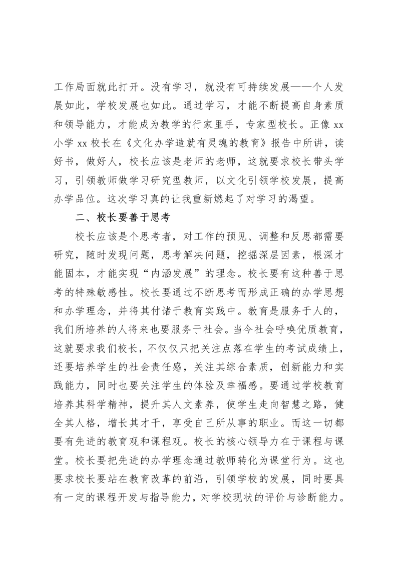 骨干校长集中培训结束后,校长分享心得,主要讲了7个方面的内容各位领导、同仁:xx月,我有幸到华东师范大学参加了Xx市小学骨干校长的培训。带着渴望,怀着激动,也带着对教育教学中的几点困惑,开始了为期七天的学习培训,整个活动在方文林教授的精心组织安排下,培训活动安排合理,内容丰富。让我们得以与众多教学专家面对面地进行互动交流,了解他们对学校管理的理解,学习他们先进的管理方法和理念;进一步了解发达地区的名校长对学校管理的造诣。很快为期七天的集中培训已经结束,在此期间,聆听着上海市教育理念最前沿的知名专家的报告,分享特级校长的办学经验和行之有效的管理操作方法。在交流和思想碰撞中感受到不同的校长的教育智慧,通过对上海市xx实验小学和xx小学实地考察,感受其优质的教育和浓厚的学校文化,进而引发自己的思考。本次培训不仅让我拓宽了思路,开阔了视野,强化了学习与研究意识,而且也让我对下一步工作有了清晰的思路。在此我非常感谢各级领导为我提供了难得的学习机会,七天的学习,使我受益匪浅,现将学习心得总结如下:一、校长要善于学习校长应该是个学习者,要做好任何一项工作都要不断地学习,校长岗位更是如此。多看看,多想想,一些灵感不期而遇,