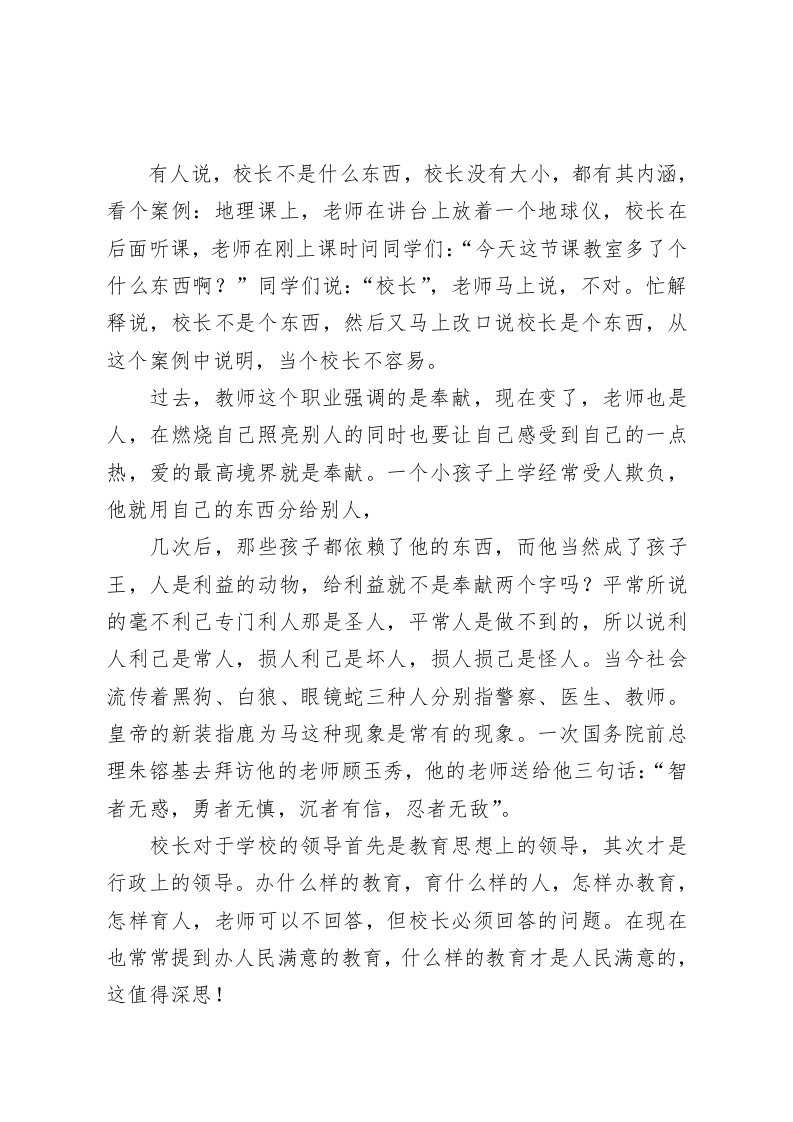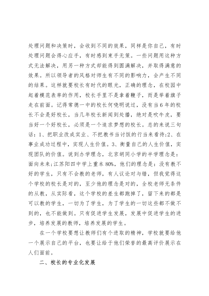 骨干校长培训后,校长汇报谈体会学校的发展离不开校长、教师的支持各位领导、同仁:xx月xx日-xx月Xx日,我参加了Xx省第五批骨干校长培训。期间,共听领导、专家教育报告9场,参观考察学校1所,参与校长晚间论坛3次。不论是聆听报告,还是考察学校、参与论坛,我都被校长培训班上那种浓厚的学术氛围、高端的思想引领、澎湃的辩论激情、全新的价值追求所感染,我的教育情怀再一次被撞击、被点燃。下面就我的学习和认识谈几点心得体会:一、校长的办学理念与思考校长是学校的领导者、决策者和高级管理者,是学科带头人,是学校领导集体的带头人,有什么样的校长,就有什么样的学校。校长的工作是对学校全局起指导、组织、协调和统揽作用,要依据国家的教育政策、法规,结合本地区、本学校的具体办学条件,统筹全校工作,正确地确定一定时期内学校的重心、中心及发展规划,并组织、协调、实施这些工作任务,务必得到预期的效果。作为一校之长,要领导好一所学校,就要有:时代的眼光,社会的良知;正确的理念,独到的见解;坚韧的品格,广阔的胸怀。作为一校之长,要领导好一所学校,并非是一件简单的事,尤其在办学条件受各种因素制约的情况下,更是如此,在工作实践中可能意识到用不同的领导风格去