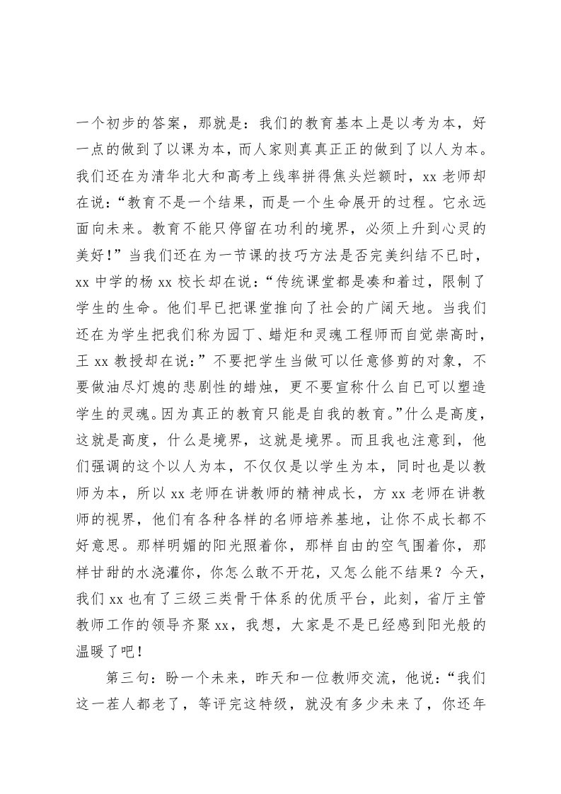 教师师培训结业式校长讲话我不去想是否能够成功,既然选择了远方,便只顾风雨兼程尊敬的省厅领导、xx培训中心的各位老师、亲爱的同学们:大家好!领导把这个发言机会给了我,我想主要是想给大家传递一个这样的信息:那就是不要害怕失败。曲折的成长之路也许更充实,挫折洗礼过的人生也许更自信。下面,我想用三句话来概括一下我今天的发言:第一句:我想说一声感谢。感谢xx省教育厅和Xx培训中心为我们提供了这样的学习机会和如此丰富有价值的系列课程。借用一句诗来表达吧:让我怎样感谢你,当我走向你,我原想采撷一片红叶,而你却给了我整个枫林;让我怎样感谢你,当我走向你,我原想亲吻一片雪花,而你却给了我整个银色的世界;我们不得不说,这的确是一次超出期待的培训,真诚的感谢你们!第二句:我想提一个问题。大教育家说过:“教育的本质就是唤醒和点燃!”这一次的培训的确点燃了我,因为我发现这几天我脑子里面一直火星子乱冒。一种混合着激动、兴奋、惊讶、困惑、迷茫等多种成分的情绪在我心中蔓延生长,最后汇聚成一个问题:xx的教育的确是先进,相比之下,我们在很多方面的确是落后了。可他们到底比我们先进在哪里了,而我们又落后在哪里了?经过几天的思考和对六场报告的梳理,我得出了