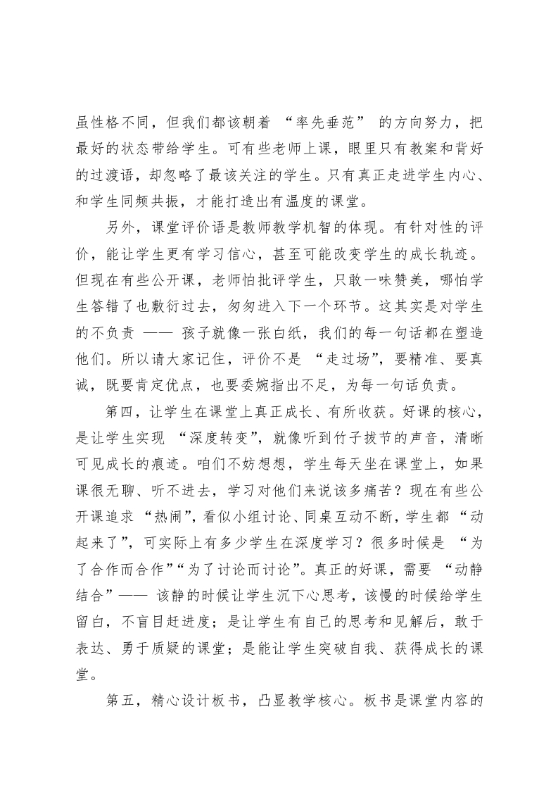 教学副校长在全体教师会上关于“好课标准”的发言各位同仁:近期参与优质课评选,两天里听了从低年级到高年级的十节课,既有老教师的课堂,也有新教师的风采。老教师们的课沉稳扎实,虽课件稍显简洁,却满含教学积淀;新教师们充满激情,善用AI等高科技手段吸引学生,课件设计更是美观大气。这十节风格各异、类型不同的课,让我在听课过程中不断思考:咱们日常教学中,究竟什么样的课才算好课?今天,我想结合这次听课体验,和大家分享关于好课标准的几点思考。评价好课,首先要学会“蹲下身”换位思考一一如果我们是学生,这节课能学到什么知识?能从老师的引导中掌握什么学习方法?会不会喜欢这节课、喜欢老师的讲解?能否专注听完三十五分钟?思维是被充分激发,还是被“填鸭式”教学填满?只有站在学生视角,才能真正读懂一堂课的价值。基于此,我认为好课应具备这五个核心特质:第一,精准把握教材、目标与重难点。教材是教学的载体,但教学绝不是“教教材”,而是要借助教材传递知识、启迪学生思维。一堂好课,必然是教师深挖教材、吃透内容的成果一一明确教学重点并突出,找准教学难点并突破,精准定位课堂目标。可现在有些老师备课,习惯先去网上搜教案,却忽略了自主研读教材的重要性。其实只有反复琢磨教材、深入思考,才能清晰知道这节课要让学生“习得什么”。尤其要强调,教