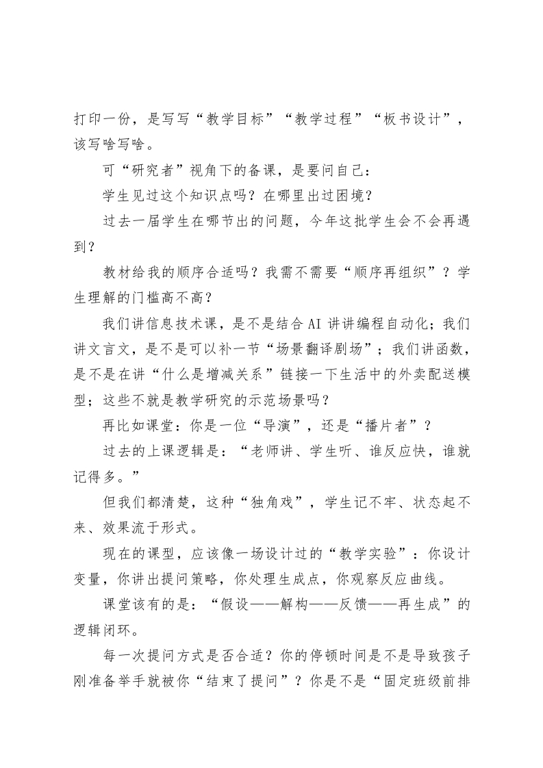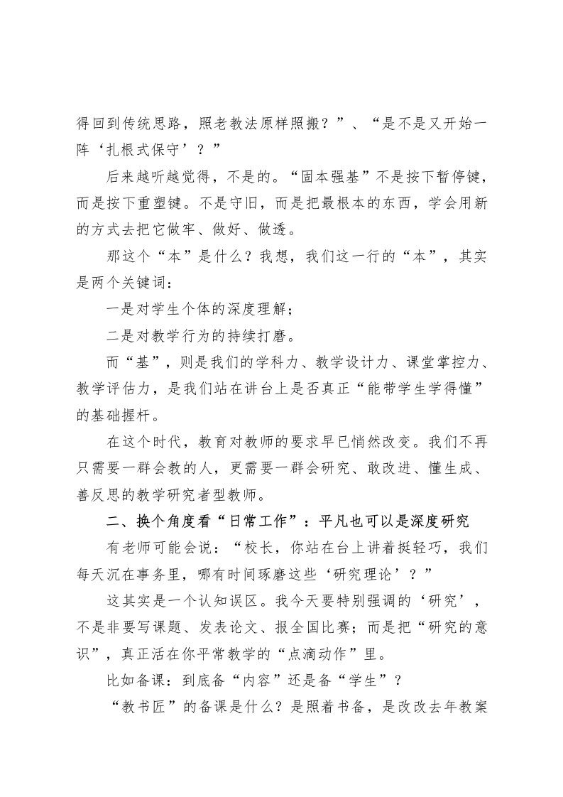教学质量提升专题会议校长讲话:两翼齐飞,才能飞得高、飞得远!尊敬的各位领导,亲爱的各位老师:下午好!今天这场培训我没有准备PPT,也不打算念材料。我只是想和大家面对面、心贴心地聊一聊当前我们身处的教育环境,以及在这样一个急剧变革的背景下,作为一名一线教师,作为一名班级的统筹者、课堂的主导者,我们应该如何重新认识自己的角色,升级自己的教育方式。我开门见山,先问大家一个问题:你觉得现在的你,是一名“传道授业解惑”的教育者,还是依然在沿用“教书匠”的工作逻辑在完成每天的教案、课时、作业批改?我相信,这个问题一提出,一定有人心里打了个转,也有人会笑而不语。但说真心话,如果你觉得其实我现在每天做的事情,也就还是备课上课改作业,那我必须很直白地说一句:这个状态是“过时”的,是不够的,是未来一定会被淘汰的。一、新时代教育工作者必须转变角色:不只是“教完”,而是“研究、生发、影响”前几天我参加了全市普通高中高质量发展论坛,现场专家、校长、教师代表轮番发言,提得最多的一个词是“固本强基”。一开始说实话,我心里有过迟疑:“这‘固’,是不是又
