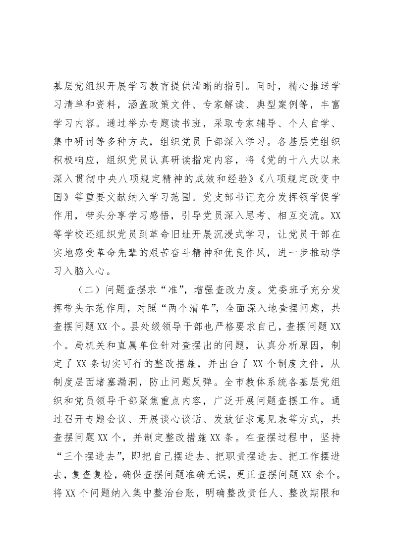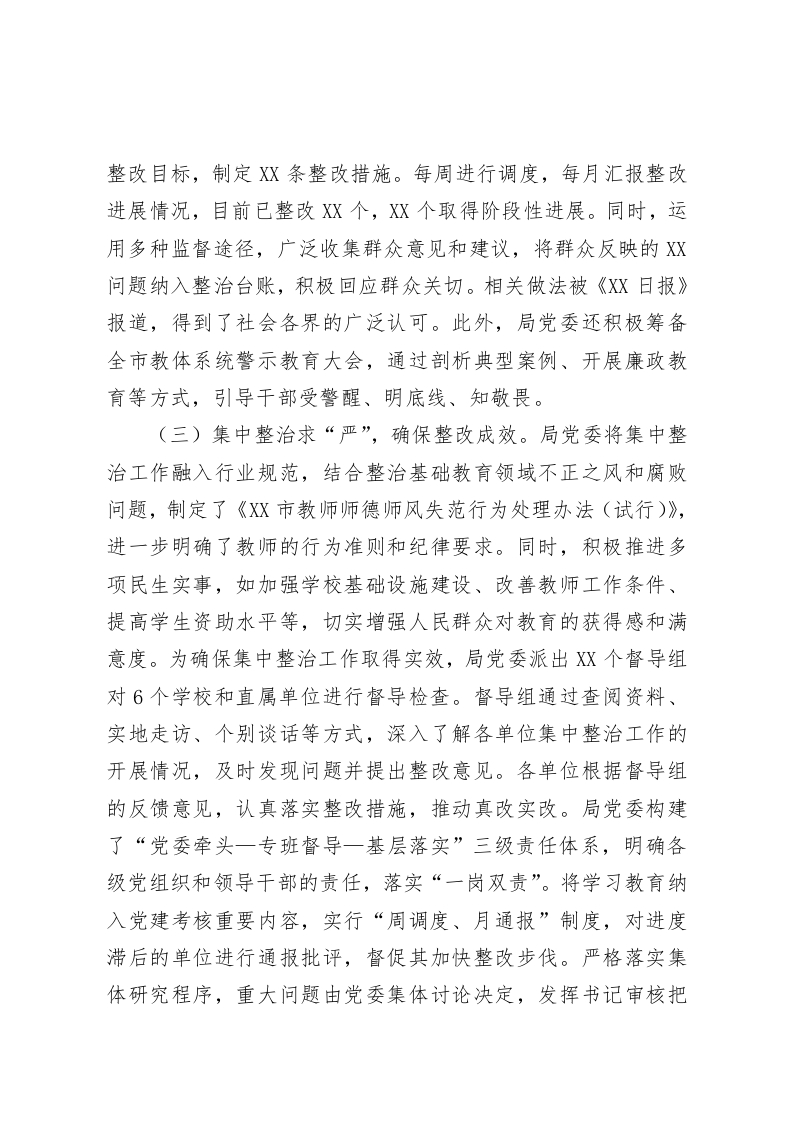 教育局党委作风建设专题工作总结为深入贯彻落实中央八项规定及其实施细则精神,持续深化作风建设,营造风清气正的教育生态环境,XX教育局党委紧密结合教育工作实际,积极推动各级党组织和广大党员干部在教育事业发展中展现新作为。切实将中央八项规定精神与新时代党的建设总要求深度融入日常工作,抓在经常、严在平常。现将有关情况汇报如下:一、工作开展情况(一)学习研讨求“深”,提升学习质效。局党委以高度的政治责任感扛起学习教育的大旗。党委书记XX同志切实履行第一责任人职责,专题听取全局学习教育工作汇报,深入剖析学习教育中存在的问题和不足,为学习教育工作指明方向。他多次以“四不两直”的方式深入基层学校调研暗访,轻车简从、直插一线,真实了解基层党组织学习教育的实际情况。在他的带动下,XX名党员领导干部和县级工作专班积极下沉基层党组织,累计调研指导达XX次。通过与基层党员干部面对面交流、查阅学习资料、参加学习活动等方式,发现并及时整改了学习教育安排不实、知识掌握不牢等问题X个,确保学习教育不走过场、取得实效。局党委坚持学习教育工作专班“周例会、半月梳理、月调度”制度,实施“三有”工作模式,即有详细的工作安排、有精准的业务提示、有及时的调度督促。定期制定学习重点任务安排,明确学习目标和要求,下发工作提示,为