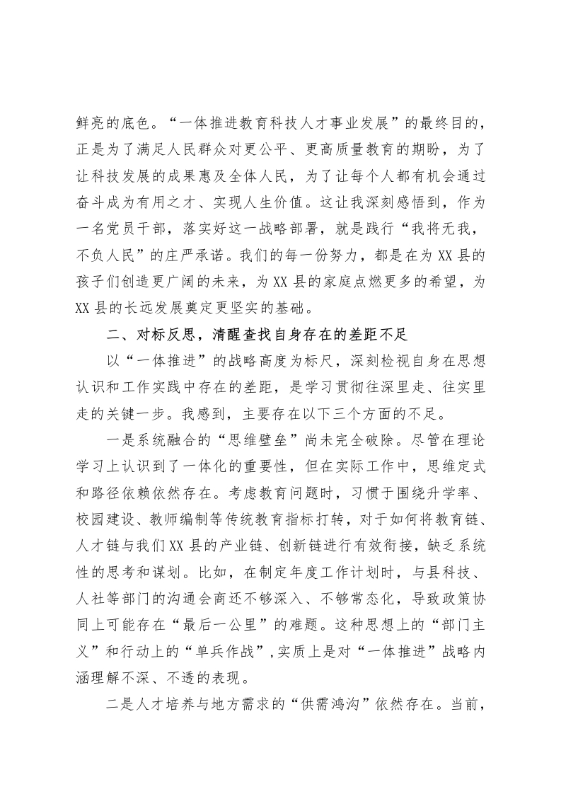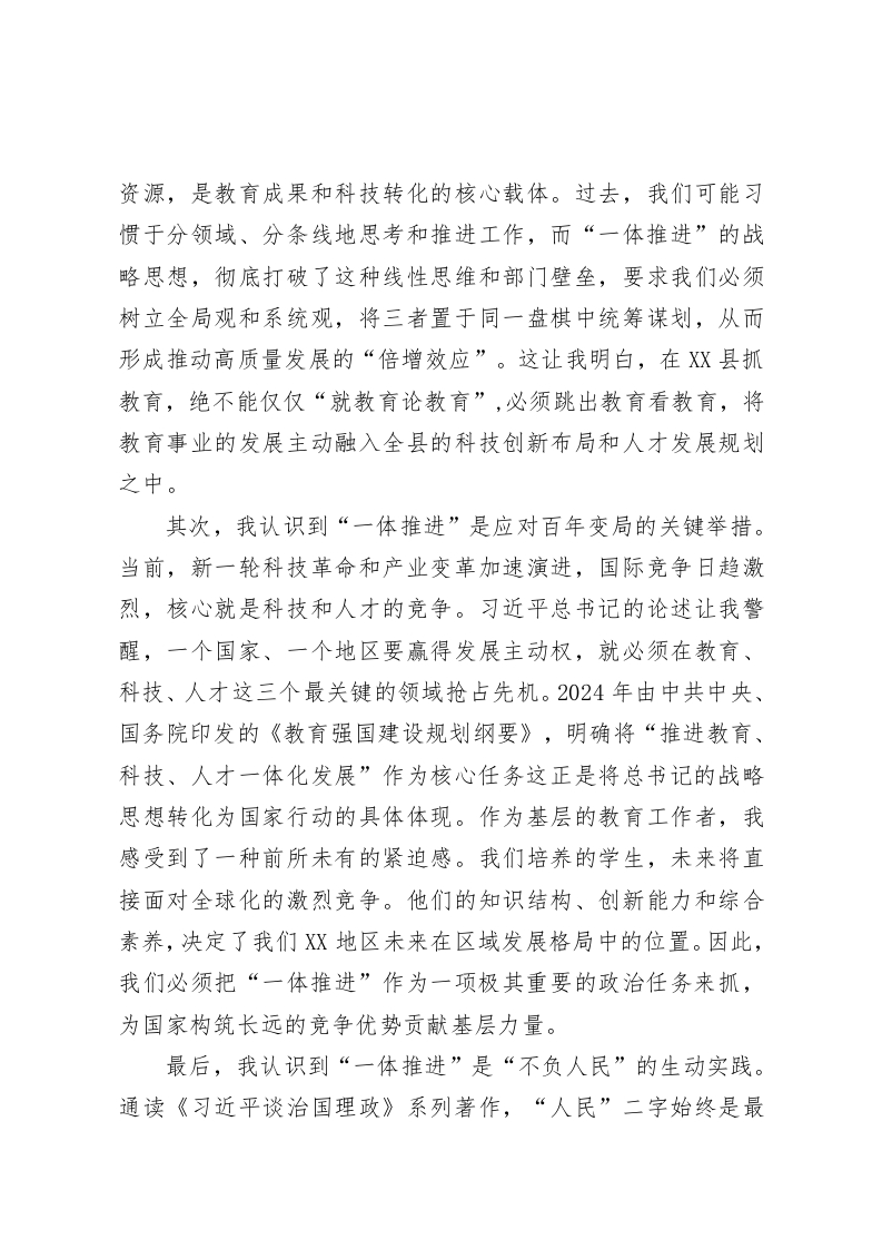 教育系统党员学习《习近平谈治国理政》第五卷心得体会(精品)近期,我怀着崇敬而求知的心情,深入学习了《习近平谈治国理政》第五卷。这部闪耀着马克思主义真理光芒的纲领性文献,思想深邃、内涵丰富,是指导我们奋进新征程、建功新时代的强大思想武器。特别是书中关于“一体推进教育科技人才事业发展”的系列重要论述,让我作为一名身处XX县基层教育战线的党员干部,深受触动、倍感振奋,也对自身肩负的使命责任有了更为清醒和深刻的认识。下面,我结合个人学习和思想实际,谈三点粗浅的认识。一、学深悟透,深刻领会一体推进的战略意蕴通过反复研读,我深刻体会到,将教育、科技、人才作为一个有机整体进行一体化部署,是党中央立足时代前沿、着眼长远发展作出的重大战略抉择。这不仅是对世界发展大势的敏锐洞察,更是加快建设中国式现代化、实现高质量发展的内在要求。首先,我认识到“一体推进”是实现国家富强的根本路径。习近平总书记强调,教育、科技、人才是全面建设社会主义现代化国家的基础性、战略性支撑。这三者紧密相连、互为支撑,构成了一个不可分割的系统整体。教育是基础,为科技创新和人才涌现提供源源不断的智力支持;科技是引擎,是第一生产力,驱动社会进步和产业变革;人才是关键,是所有发展的第一