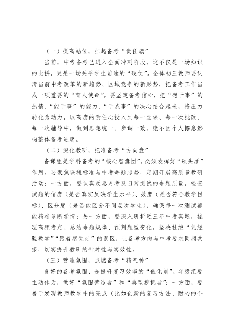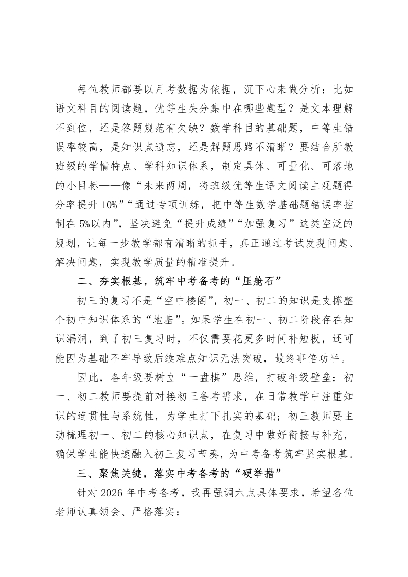 凝心聚力备中考,砥砺奋进创佳绩一一在初三月考质量分析暨中考备考推进会上的讲话各位初三教师同仁:今天,我们怀着共同的目标齐聚于此,召开初三月考质量分析暨中考备考推进会。此刻距离2026年中考已不足一年,这是初三学子冲刺梦想的关键阶段,更是我们全体初三教师肩负使命、攻坚克难的重要时期。本次会议的核心任务,就是复盘开学以来的教学成果,精准梳理学情教情中的问题与不足,为接下来的备考工作锚定方向、细化举措,确保每一步复习都有目标可依、有计划可循、有方法可施,全力推动2026年中考备考工作走深走实。作为学校初三教学的“主力军”,大家的每一堂课、每一次辅导、每一份用心,都直接关系着学生的升学之路,也承载着学校的育人使命。希望各位老师能以此次会议为契机,统一思想、凝聚共识,把备考压力转化为前进动力,把教学责任落实到具体行动,共同打好这场关乎学生未来、关乎学校发展的中考硬仗。一、以考为镜,找准教学改进的“突破口”考试的核心价值,从来不是简单的分数排序,而是“以考促学、以考促教”的诊断与提升。这次月考的成绩,不是教学的“终点线”,而是我们调整教学策略、优化复习方向的“风向标”和“导航仪”。