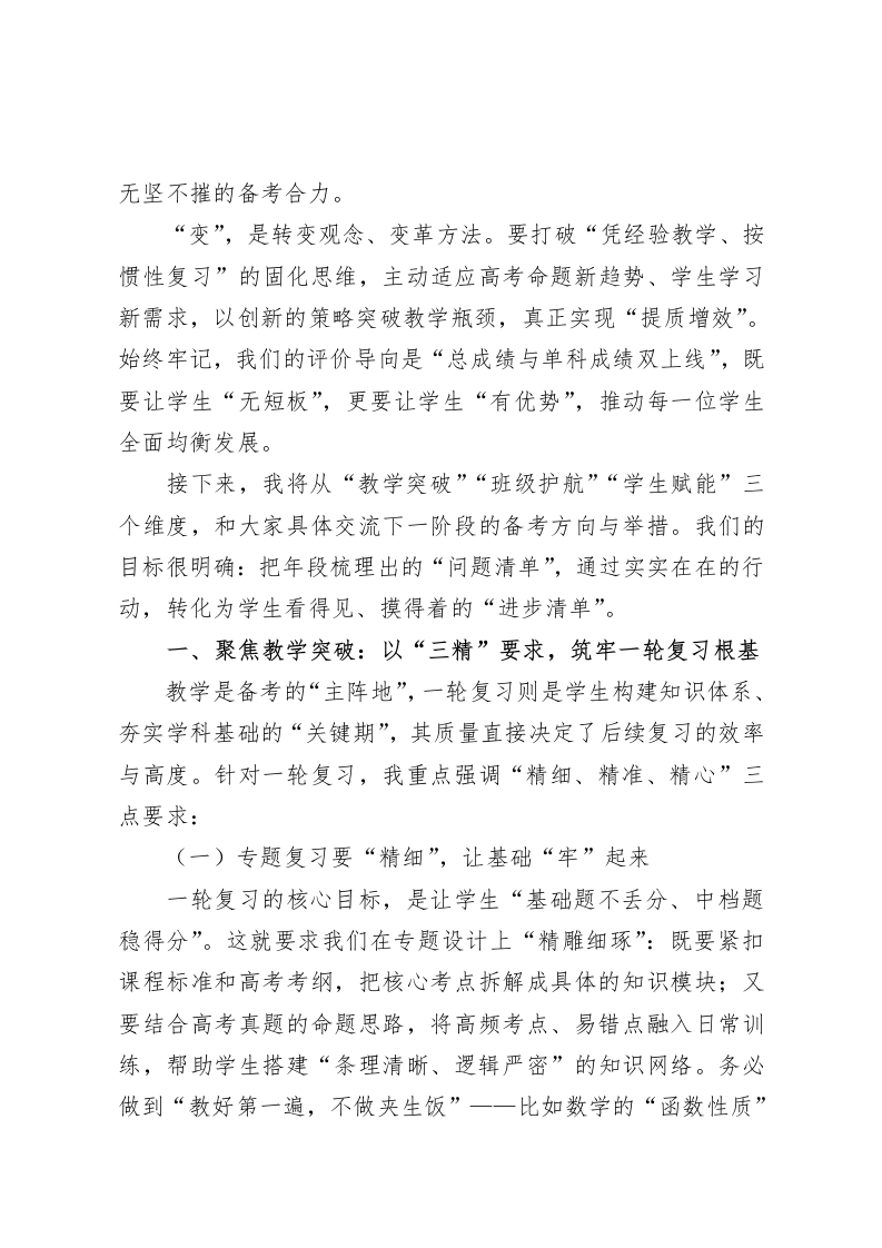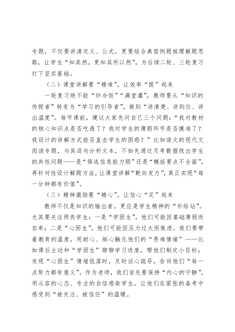 深耕一轮复习,聚力决胜高考在高三教学质量分析会上的讲话尊敬的各位高三教师:大家下午好!今天,我们怀着复盘过往、谋划未来的初心齐聚一堂,召开高三教学质量分析会。这既是对前一阶段教学工作的深度梳理,更是为冲刺高考校准方向、优化策略的关键部署。首先,我代表学校,向奋战在高三一线的每一位老师,致以最诚挚的感谢与最崇高的敬意!过去这段时间里,我见证了大家清晨相伴学生早读的身影,看到了深夜代案批改作业的灯光,也感受到了大家面对教学难题时的执着与坚守。我们取得的每一点进步、每一份成绩,都凝聚着在座各位的心血与智慧。这份“以生为念、以教为业”的担当,正是我们直面挑战、决胜高考的最坚实底气。分析成绩,绝不是简单的“看分数、排名次”,其核心意义在于“以数据为镜,照见问题;以复盘为基,照亮前路”。我们既要看到优势、坚定信心,更要敢于正视短板、深刻反思。基于此,今天我想围绕“聚变”二字,与大家探讨下一阶段的备考思路。“聚”,是凝聚力量、汇聚共识。要把全体高三教师的教学智慧聚起来,把学生的学习动力聚起来,把家校社的协同支持聚起来,让每一份力量都朝着“决胜高考”的目标发力,形成