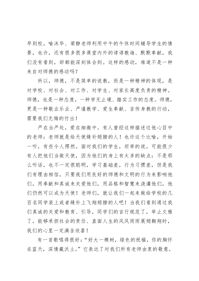 师德师风培训,校长发言师者为师亦为范,学高为师,德高为范尊敬的各位领导,各位老师:大家好!根据学校的安排,师德培训X月X日开始,作为校长,我在这里和大家就师德师风、爱岗敬业做一个发言。其实在座的老师们在各个方面都各有所长,这么一个严肃的话题也不是我几句肤浅的话能够来描述和表达的,所以,如果有不恰当的地方,请大家指正、包涵。师德,顾名思义,就是教师具备的道德素养;师风,是教育这个行业的风尚风气。记得法国作家卢梭说过:“榜样!榜样!没有榜样,你永远不能成功地教给儿童以任何东西”,法国作家罗曼·罗兰也说过:“要撒播阳光到别人心中,总得自己心中有阳光。”我想,作为教师,我们的师德就应当是这里所说的“榜样”和“阳光”吧。如果我们自己都不具有那样的“榜样”和“阳光”,又能如何在你的学生心中撒播这些东西呢?爱岗敬业,严谨治学,为人师表,诲人不倦…这些都是良好师德的写照。师者为师亦为范,学高为师,德高为范。走上三尺讲台,教书育人;走下三尺讲台,为人师表。中国古代大教育家孔子说过:“其身正,不令则行。其身不正,虽令不从。”育人者当先自律。作为教师,我们是学生在学校生活中接触最多的人,