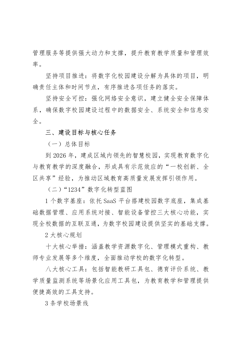 数字化校园建设行动方案(2025修订)一、建设背景与意义党的二十大明确提出“推进教育数字化”的战略部署,《数字中国建设整体布局规划》也对教育数字化作出了全面指引。在这样的大背景下,为积极响应国家及地方相关要求,学校正式启动《数字校园建设行动方案(2024-2026年)》。本方案以打造区域数字教育示范校为目标,旨在通过数字化技术深度赋能教育教学、管理服务以及人才培养等各个环节,全面提升学校的核心竞争力,为所在区域的教育高质量发展树立标杆,推动教育事业迈向新的高度。二、指导思想与基本原则(一)指导思想以习近平新时代中国特色社会主义思想为指引,坚定不移地落实立德树人的根本任务,将教育数字化转型作为关键引擎,以此推动教育理念的更新、教学模式的变革以及治理能力的升级,努力构建一个“人人皆学、处处能学、时时可学”的智慧校园生态环境。(二)基本原则坚持立德树人:始终将德育放在首位,确保数字化建设与育人目标紧密结合,培养德智体美劳全面发展的社会主义建设者和接班人。坚持数字赋能:充分发挥数字化技术的优势,为教育教学、