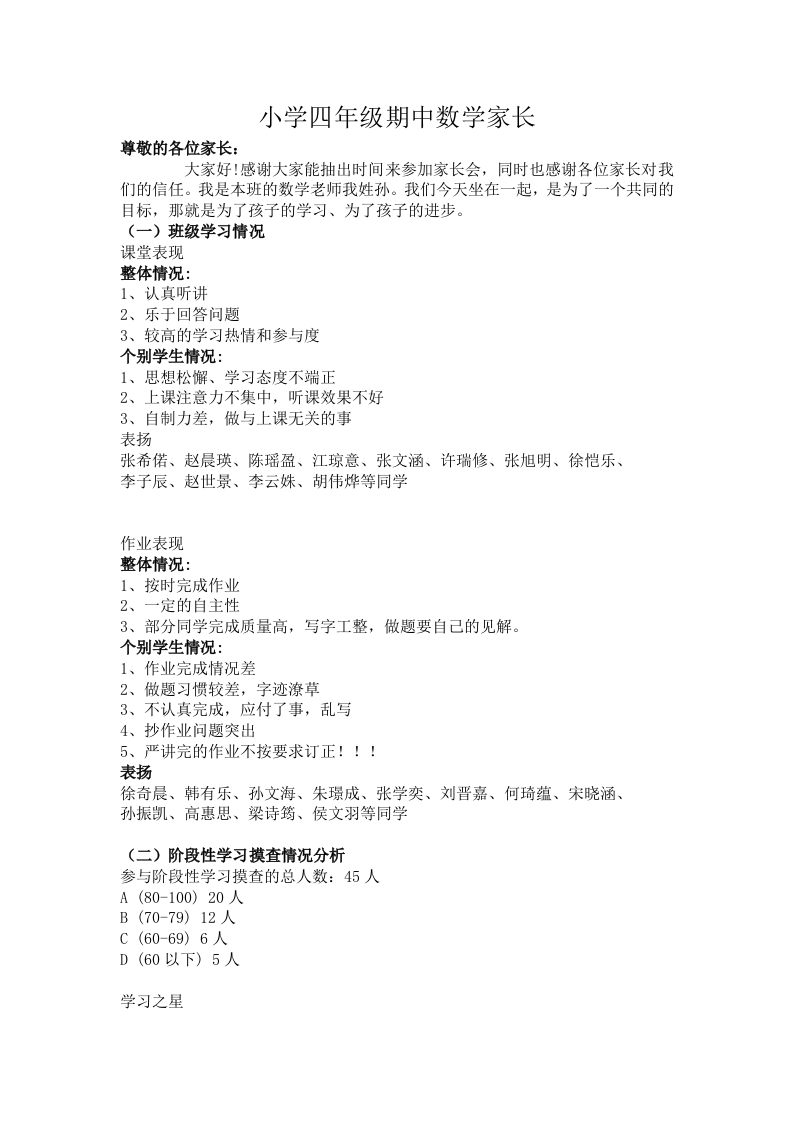 小学四年级期中数学家长尊敬的各位家长:大家好!感谢大家能抽出时间来参加家长会,同时也感谢各位家长对我们的信任。我是本班的数学老师我姓孙。我们今天坐在一起,是为了一个共同的目标,那就是为了孩子的学习、为了孩子的进步。(一)班级学习情况课堂表现整体情况:1、认真听讲2、乐于回答问题3、较高的学习热情和参与度个别学生情况:1、思想松懈、学习态度不端正2、上课注意力不集中,听课效果不好3、自制力差,做与上课无关的事表扬张希偌、赵晨瑛、陈瑶盈、江琼意、张文涵、许瑞修、张旭明、徐恺乐、李子辰、赵世景、李云姝、胡伟烨等同学作业表现整体情况:1、按时完成作业2、一定的自主性3、部分同学完成质量高,写字工整,做题要自己的见解。个别学生情况:1、作业完成情况差2、做题习惯较差,字迹潦草3、不认真完成,应付了事,乱写4、抄作业问题突出5、严讲完的作业不按要求订正!!!表扬徐奇晨、韩有乐、孙文海、朱璟成、张学奕、刘晋嘉、何琦蕴、宋晓涵、孙振凯、高惠思、梁诗筠、侯文羽等同学(二)阶段性学习摸查情况分析参与阶段性学习摸查的总人数:45人A(80-100)20人B(70-79)12人C(60-69)6人D(60以下)5人学习之星
