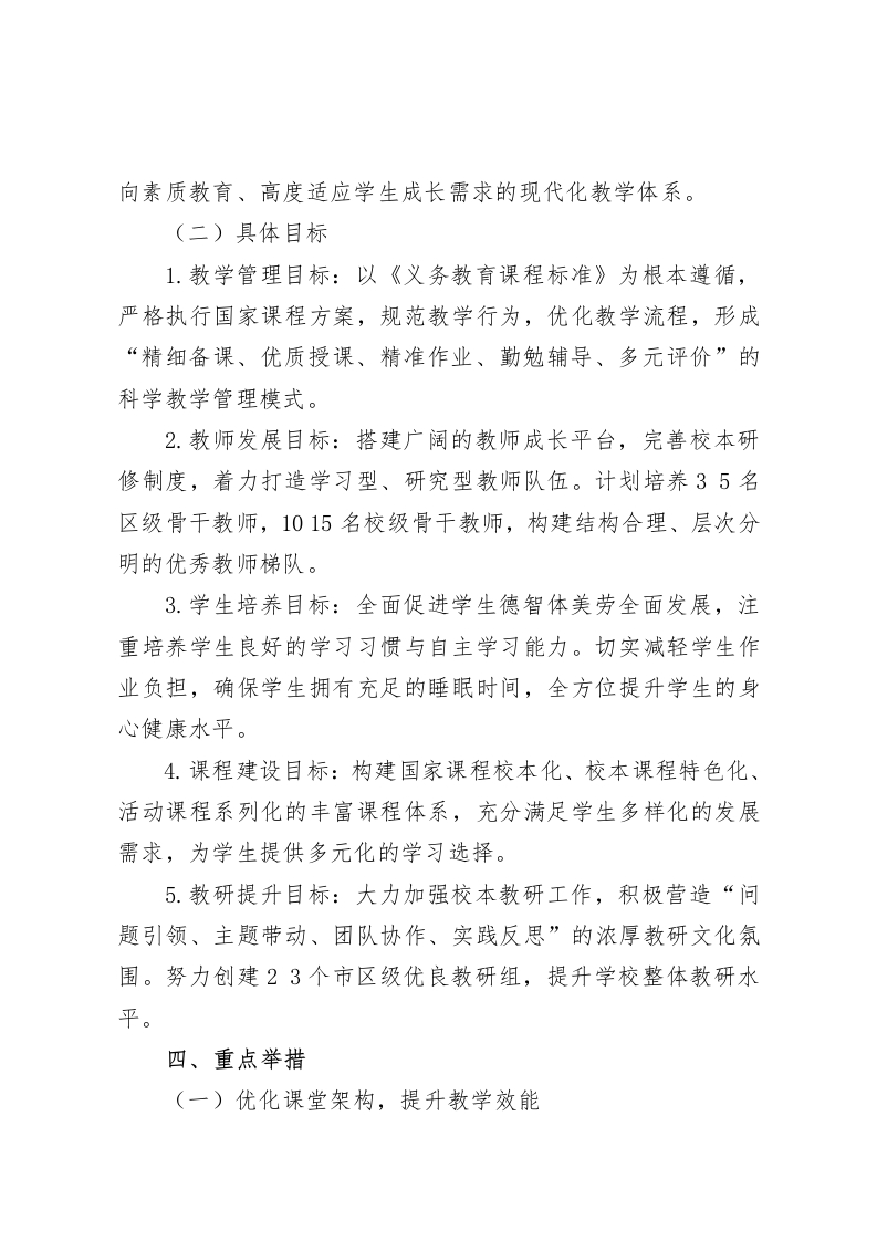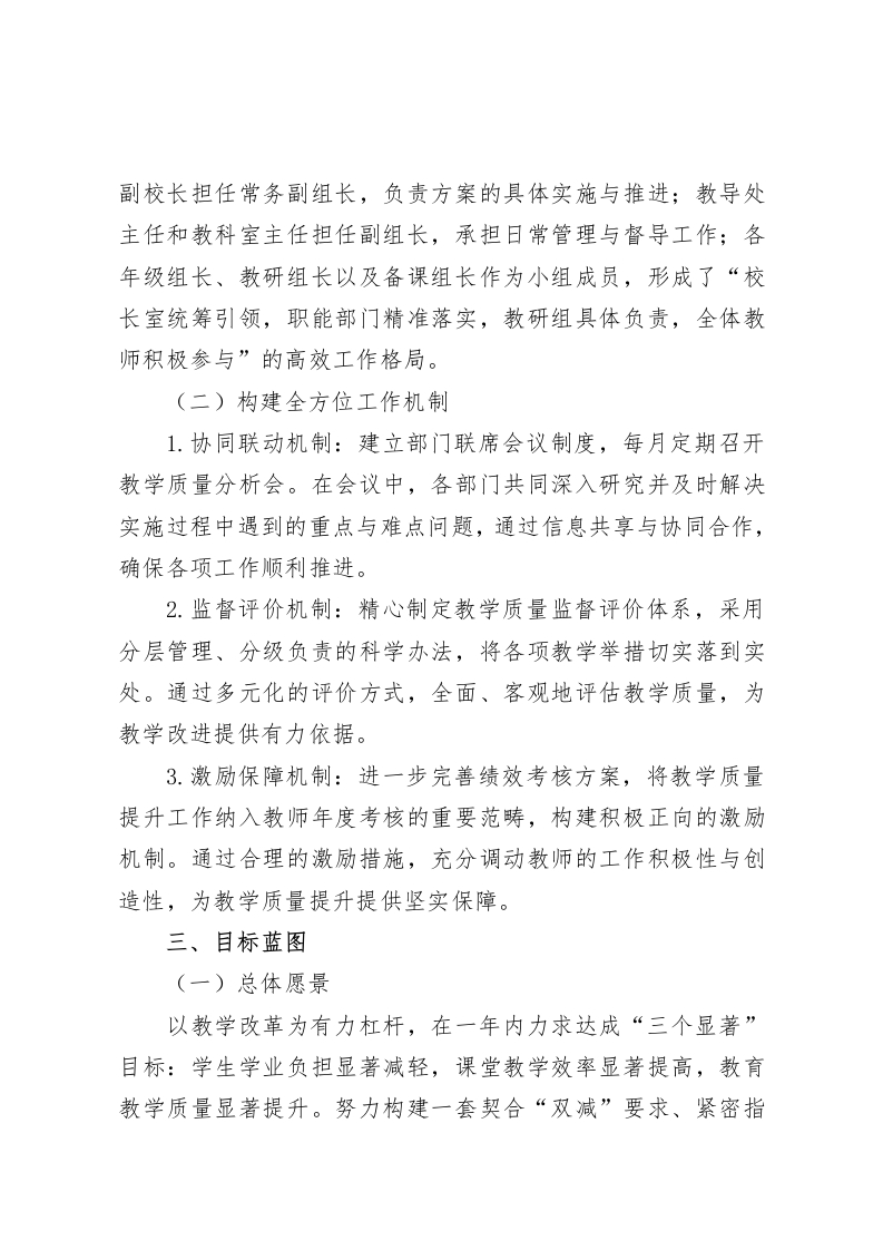 提高课堂教学质量实施方案:“准”“透”“活”“实”“新”“趣”“效”“思”!一、指导方针在当今教育变革的关键时期,教育部“双减”政策犹如春风化雨,为义务教育阶段的教育发展指明了新方向。我校积极响应这一政策号召,以构建高质量教育体系为核心目标,将提升课堂教学质量作为贯穿始终的主线,以深化教育教学改革为强大动力。秉持立德树人的根本使命,我们深入遵循教育规律与学生成长规律,充分强化学校教育的主阵地功能,致力于打造充满活力与高效的课堂,全面优化教学方式,加强精细化教学管理,建立健全科学合理的教学评价机制,全方位促进学生在德智体美劳各方面的均衡发展,助力学生健康茁壮成长。紧密结合我校实际情况,我们以“减负提质、增效赋能”为核心工作思路,以校本教研为重要切入点,以教师专业发展为坚实保障,将培养学生的核心素养作为根本目标,全力以赴推动教育教学质量实现系统性提升,努力打造让人民群众满意的优质教育。二、保障架构(一)设立专项工作领导小组为切实推动“双减”背景下学校教学质量提升工作有序开展,我校精心组建了以校长为组长的质量提升工作领导小组。校长统筹全局,全面负责工作的整体规划与决策;分管教学的