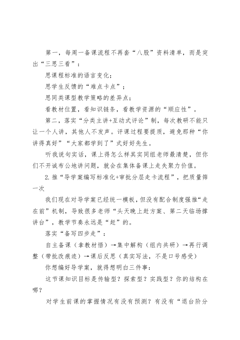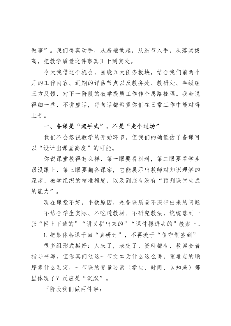醍瑚灌顶!教学会议,校长:提升教学质量,要从这5方面下功夫!各位老师:大家上午好!今天咱们聚在一块儿,不为别的,就是聊聊教学。聊什么教学?就这六个字:怎么提质量。这不是新话题。我们每学期都讲,每场教师大会基本都提。可现在这个时间节点,我认为,我们再讲一次教学质量,不仅有必要,而且非常紧迫。为啥这么说?一来,“三新”改革步子快。课程标准已更新,教材体系改了结构,我们过去拿教材走流程那一套,已经不灵了。而新高考路径已经实质落地,过去拼答题技巧,如今更多考查素养迁移,用老办法对新变化,该改。二来,新的比较维度上来了。很多兄弟学校在信息化、教研制度、课堂改革方面大胆落子,进步很快。如果我们还停留在原来的节奏慢磨,那只能被甩开。三来,我们学校自身要跨“窄门”。我们结构上看似稳,其实教学管理、课堂实效、教研成效这三块,全面“抬头看”,还存在不小的短板,而且部分关键指标和区域某些重点学校的差距不是在缩小,而是在扩大!所以,我们不能再“改一点看一点”,更不能“喊口号不