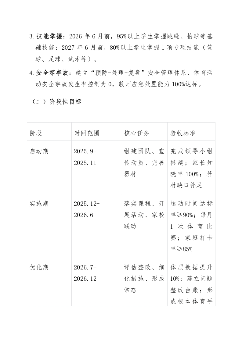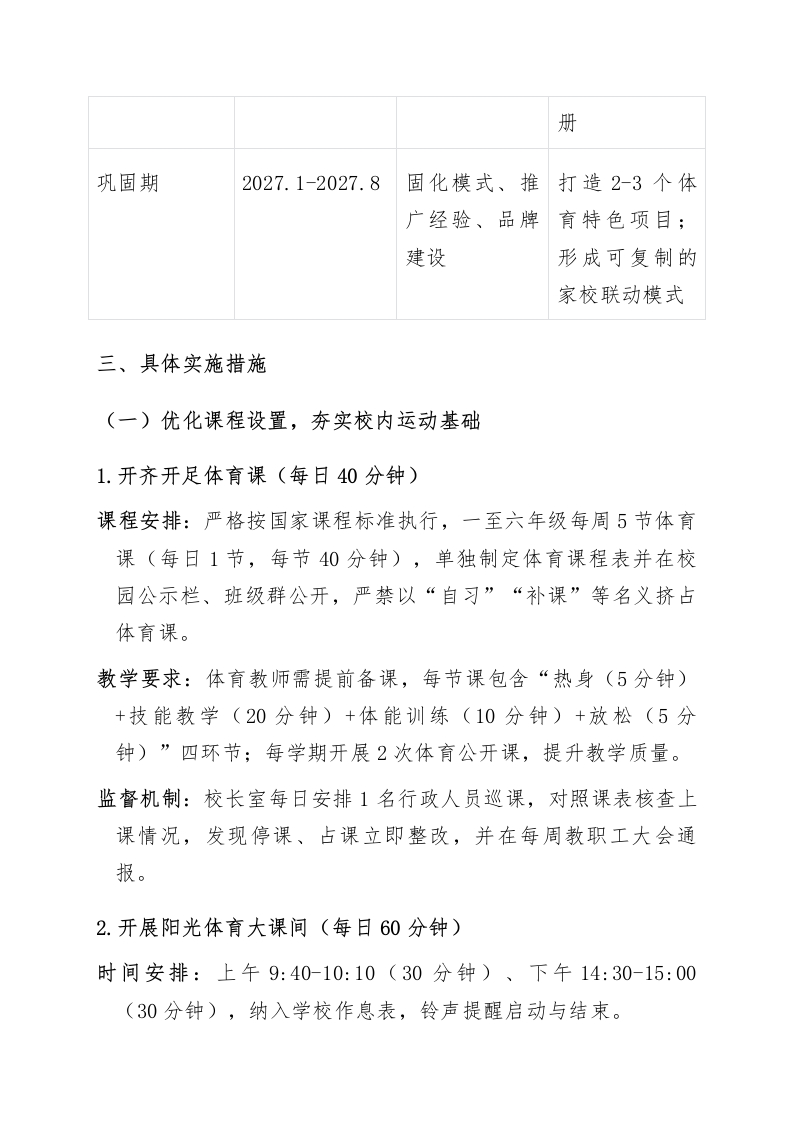 小学保障学生每天综合体育活动时间不低于两小时实施方案(完整版)一、指导思想为深入贯彻《关于全面加强和改进新时代学校体育工作的意见》《国家学生体质健康标准》等文件要求,落实上级部门“加强青少年体育、增强青少年体质”的工作部署,牢固树立“健康第一”的育人理念与“五育并举”的教育观,切实破解学校体育“重形式、轻实效”问题。通过系统化规划、分层化实施、家校化联动,保障全体学生每日校内、校外综合体育活动时间累计不低于2小时,助力学生强健体魄、掌握1-2项运动技能、养成终身锻炼习惯,营造“我运动、我快乐、我健康”的校园体育文化,为学生终身发展筑牢健康根基。二、工作目标(一)总体目标1.时间达标:2025年9月前实现全体学生每日校内体育活动时长≥120分钟,结合校外锻炼累计≥180分钟;2026年3月前全面达成“每日累计≥200分钟”目标,实现“班班落实、人人参与”。2.体质提升:2025-2026学年《国家学生体质健康标准》测试合格率≥98%、优良率≥65%、优秀率≥18%;2026-2027学年合格率≥99%、优良率≥70%、优秀率≥22%,逐年稳步提升。