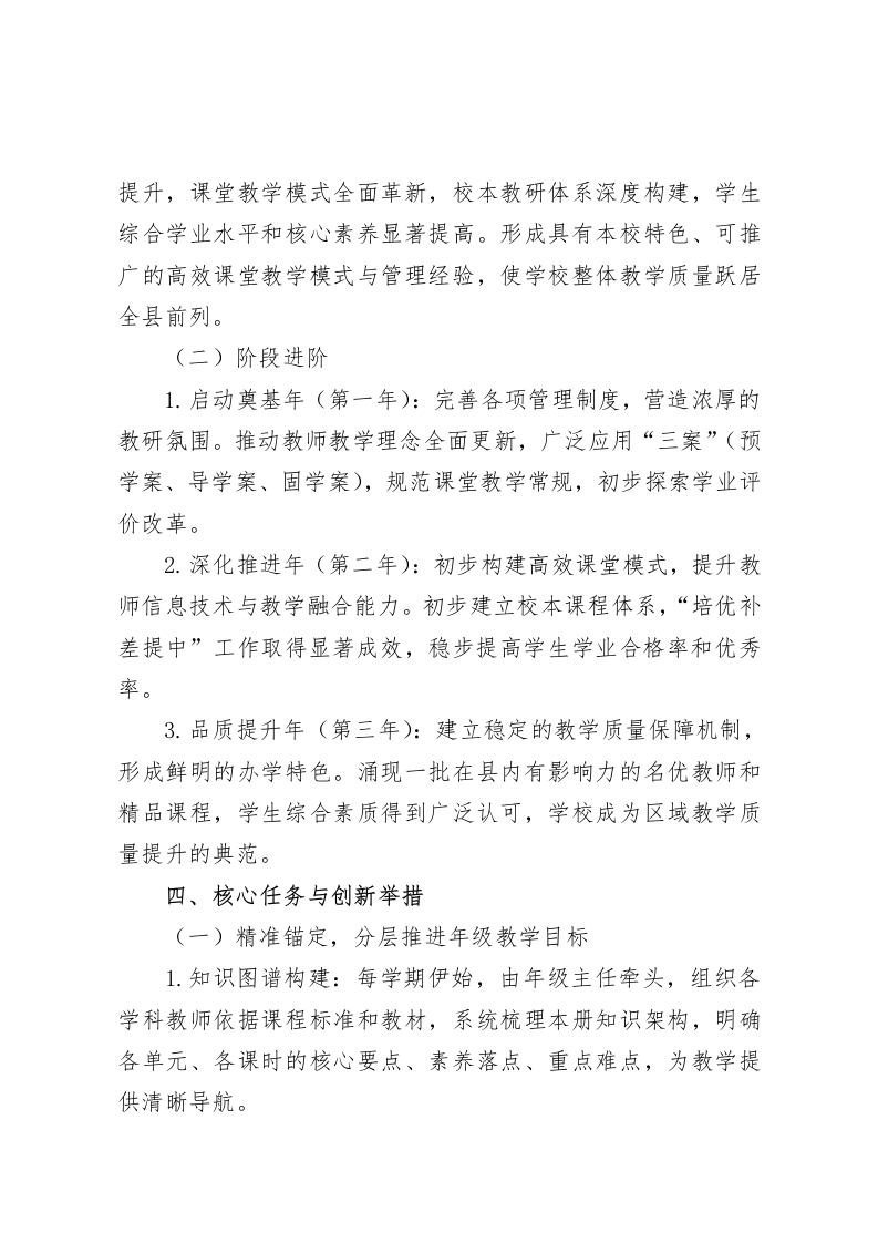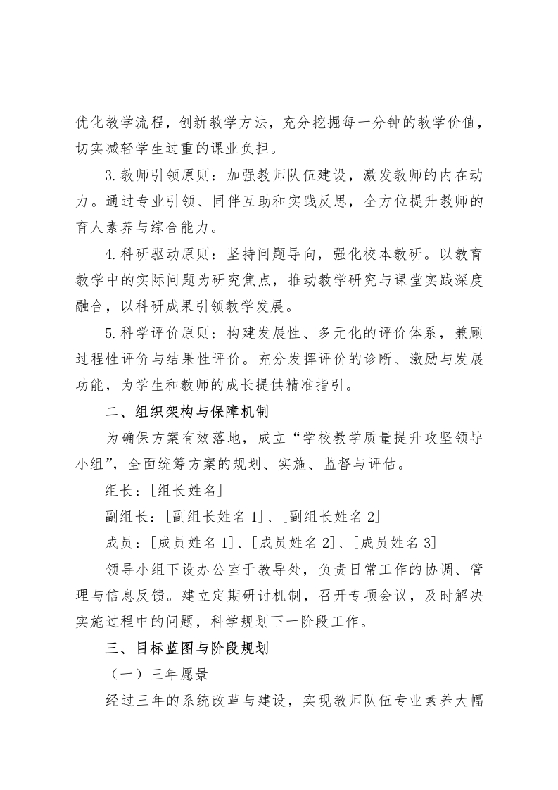 小学提升教学质量实施方案在教育改革与发展的关键时期,为积极响应并深入落实《县教育高质量发展三年提升计划》文件精神,全面推动我校教育教学工作迈向新高度,特制定本具有创新性与前瞻性的实施方案。一、理念领航与原则坚守(一)理念灯塔以国家教育方针为坚固基石,以《县教育高质量发展三年提升计划》为行动指针,将“立德树人”作为教育的核心使命。以课程改革为驱动引擎,以课堂教学为核心战场,全方位推行素质教育。秉持“学生为本”的教育理念,遵循学生身心发展与教育教学规律,强化“五育”协同共进,着重突出“智育提效”与“体育固本”,促进德育、美育、劳育深度融合,构建充满活力、高效互动、独具特色的课堂新生态,营造有利于教师专业成长、学生全面发展的优质教育环境,实现学校教育教学质量的稳健、持续提升。(二)原则指引1.学生本位原则:尊重学生的个体差异,如同珍视每一颗独特的星星。激发学生的主体意识,培养自主学习与合作探究能力,为每个学生量身定制个性化的成长路径,确保其可持续发展。2.课堂聚焦原则:将课堂作为提升教学质量的核心阵地,