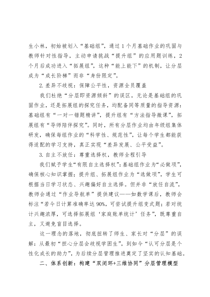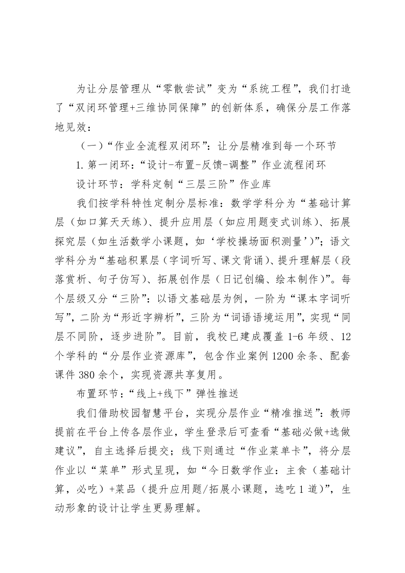 小学学校作业分层管理创新实践与成长,校长亮点汇报:“双减”赋能,精准分层尊敬的各位领导、教育同仁:大家好!“双减”政策落地以来,我校始终将“作业改革”作为减负增效的核心突破口。面对学生认知水平、学习能力的差异化现状,我们摒弃传统“一刀切”作业模式,以“让每个孩子在作业中找到成长自信”为目标,探索出一套兼具“精准性、趣味性、协同性”的作业分层管理体系。今天,我重点从“理念创新、体系构建、成效亮点、未来规划”四个维度,汇报我校分层管理的实践成果。一、理念破局:锚定“三不”原则,重塑分层作业价值定位在分层管理推进初期,我们首先解决“为何分层、如何分层”的认知问题,确立“三不”核心原则,为分层工作划定方向:1.分层不分类:拒绝标签化,尊重个体差异我们明确“分层是动态适配,不是固定归类”。每学期初通过“学情三维测评”(知识掌握度、能力熟练度、兴趣倾向),为学生划定初始分层,但不贴“优等生/学困生”标签,而是以“基础组、提升组、拓展组”命名,且每月根据课堂表现、作业反馈、学生自主申请进行动态调整。例如,三年级(2)班学