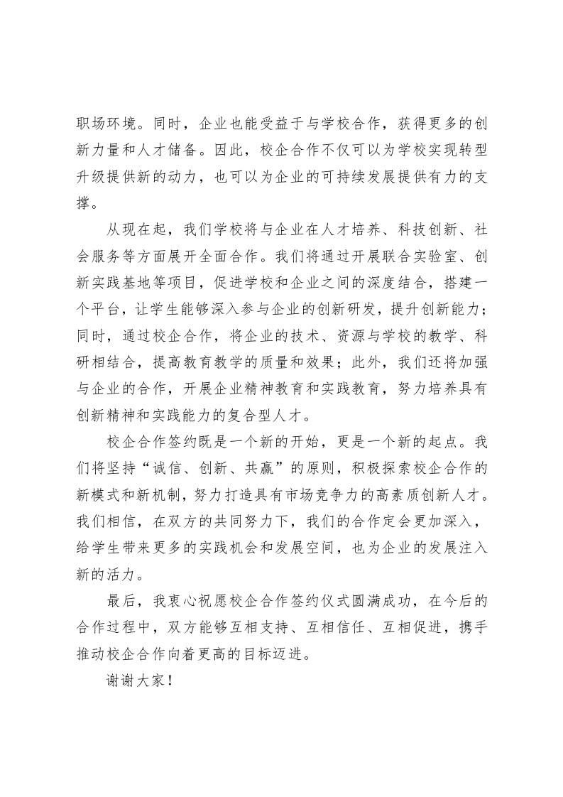 校企合作签约仪式,中职校长发言给学生带来更多的实践机会和发展空间,也为企业的发展注入新的活力尊敬的各位领导,亲爱的师生们:大家好!今天,我们在这里荣幸举行校企合作签约仪式,这是一次具有重大意义的盛会,标志着我校与企业之间的深度合作正式起航。在此,我代表学校向与会的各位嘉宾表示热烈的欢迎和衷心的感谢!校企合作,一直以来都是职业高中发展的重要方向之一。作为我们学校的领导,我们深知校企合作的重要性,也明白这是一个共赢的机会,不仅可以推动学校的发展,也可以为企业提供更多优秀的人才。长期以来,我们学校一直秉承着与企业合作共赢的原则,与各个企业建立了良好的合作关系。今天,我们迎来了新的合作伙伴,这不仅是我们校企合作发展的又一里程碑,也是我们进一步拓展校企合作的重要举措。在过去的时光里,我们学校积极推进人才培养体系的改革,大力提升教学水平和人才培养质量。然而,教育只是学生成长道路上的一站,而校企合作,可以使学生在校园与企业之间实现无缝衔接,将所学知识与实践结合起来,提高学生的实践能力、创新能力和综合素质。通过与企业的合作,学生们可以接触到真实的工作场景,了解企业的运作模式和需求,提前适应