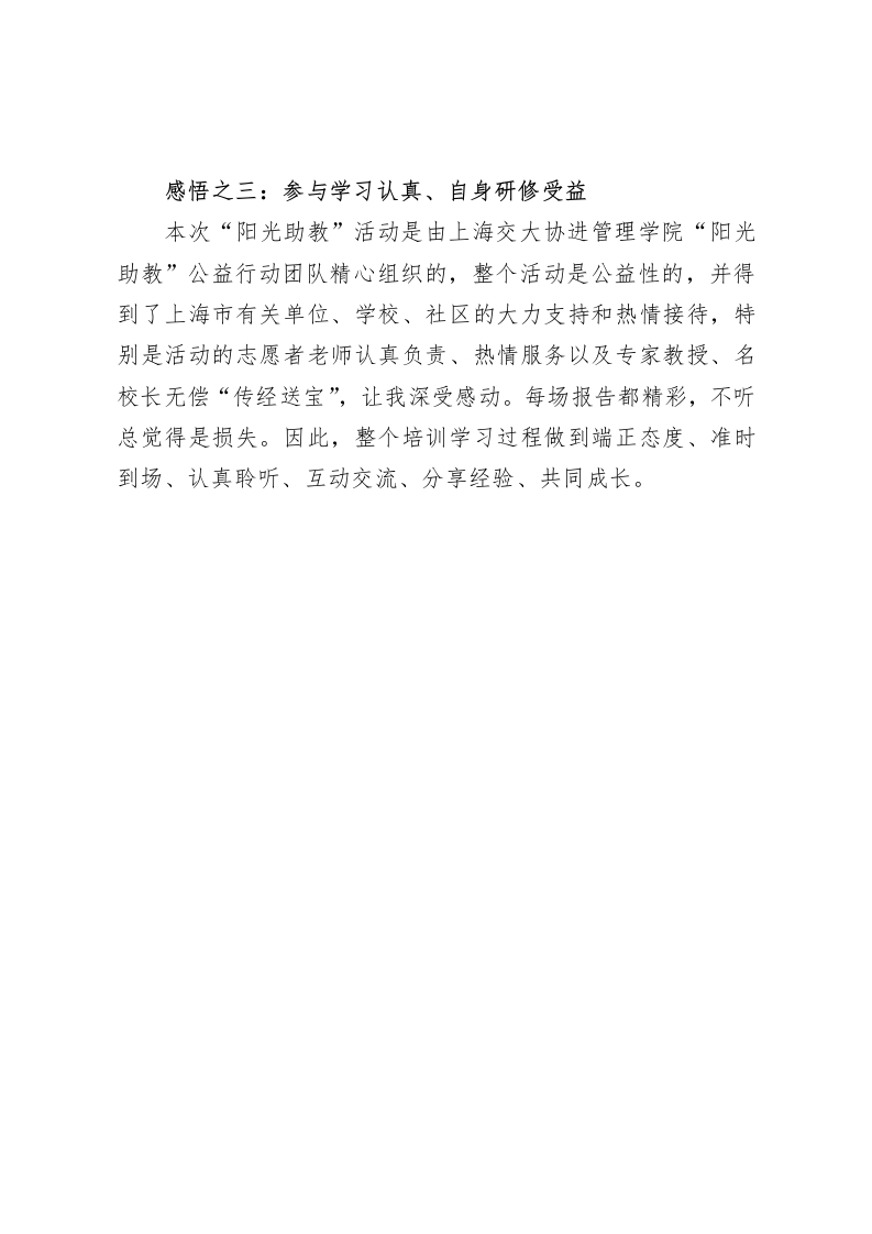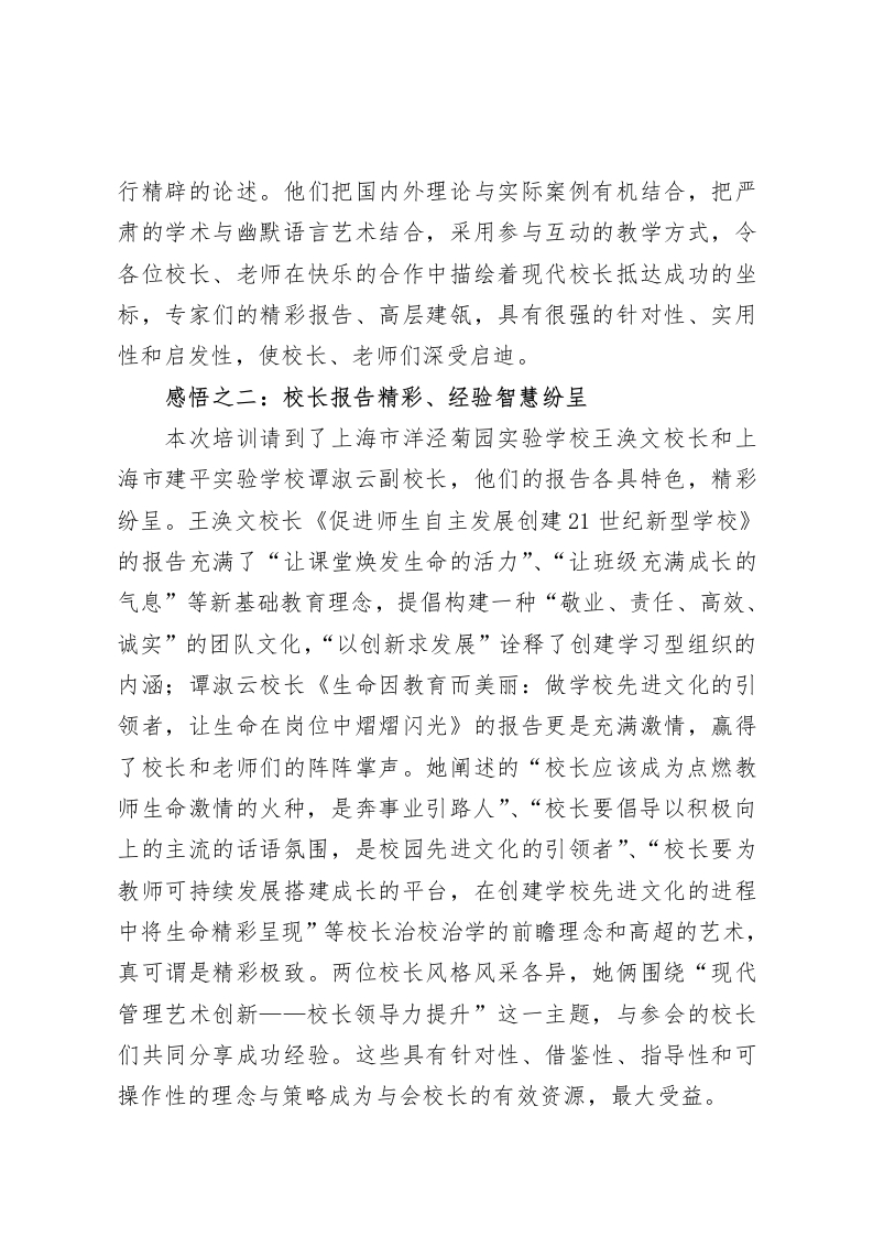 校长培训心得体会汲取现代理念感悟管理真谛随着素质教育的全面推进,给学校管理者带来了全新的机遇和挑战,校长如何在新课程改革下切实转变职能,运用全新的教育理念与管理模式,抓住机遇,创办有利于师生共同成长的高质量的特色学校已成为学校发展的焦点。Xx年Xx月xx日一一xx月Xx日,我有幸参加了上海Xx举办的x暨校长管理能力提升业务培训。本次活动为校长们提供一个交流思想、解决困扰、共享经验的平台,以专家讲座、名校长传经为主,通过管理案例论述、经验分享、参与式互动交流,使参加培训的我从中受到启发,获得感悟。感悟之一:专家引领经典,学习收获颇丰在本次xx培训中,我们听取了上海市教育局政策法规处朱坚处长的《教育法律制度介绍》,他对我国教育法律法规建设情况进行总体阐述,特别对新的《义务教育法》和十部委联合颁发的学校安全管理法规进行较为详细辅导,使与会校长、老师增强了依法治校、依法施教意识。华东师大基础教育改革与发展研究所所长杨小微教授、华东师大心理学系李晓文教授,上海交大安泰管理学院胡巍教授分别就《小学教学改革与课程改革》、《学生情绪表达与身心和谐发展》、《学生学习动机培养》、《学校团队建设与管理沟通》等专题作了精彩的报告。以他们广博的知识和深厚的学术研究为背景,站在改革的最前沿,进