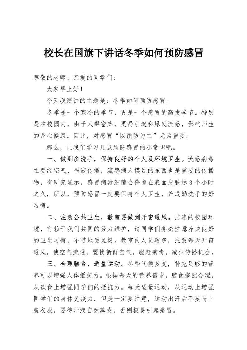 校长在国旗下讲话冬季如何预防感冒尊敬的老师、亲爱的同学们:大家早上好!今天我演讲的主题是:冬季如何预防感冒。冬季是一个寒冷的季节,更是一个感冒的高发季节。特别是在校园内,由于人群密集,更易引起和爆发流感,影响师生的身心健康。因此,对感冒“以预防为主”尤为重要。那么,让我们学习几点预防感冒的小常识吧。一、做到多洗手,保持良好的个人及环境卫生。流感病毒主要经空气、唾液传播,流感病人摸过的东西也是重要的传播物,有研究显示,感冒病毒细菌会停留在表面皮肤达3个小时之久,所以,预防感冒一定要保持个人卫生,养成勤洗手的好习惯。二、注意公共卫生,教室要做到开窗通风。洁净的校园环境,有赖于我们共同的努力维护,请同学们务必注意养成良好的卫生习惯,不随地丢垃圾。教室内人员较多,注意每天开窗通风,使空气流通,置换新鲜空气,驱赶病毒,减少传播机会。三、合理膳食,适量运动。冬季气候多变,补充足够的营养可以增强人体抵抗力。根据每天的营养需求,膳食搭配合理,从饮食上增强同学们的抵抗力。每天适量运动,从运动上增强同学们的身体免疫力。但是一定要注意,运动出汗后不要马上脱衣服,要待汗液自然蒸发,否则极易引起感冒。