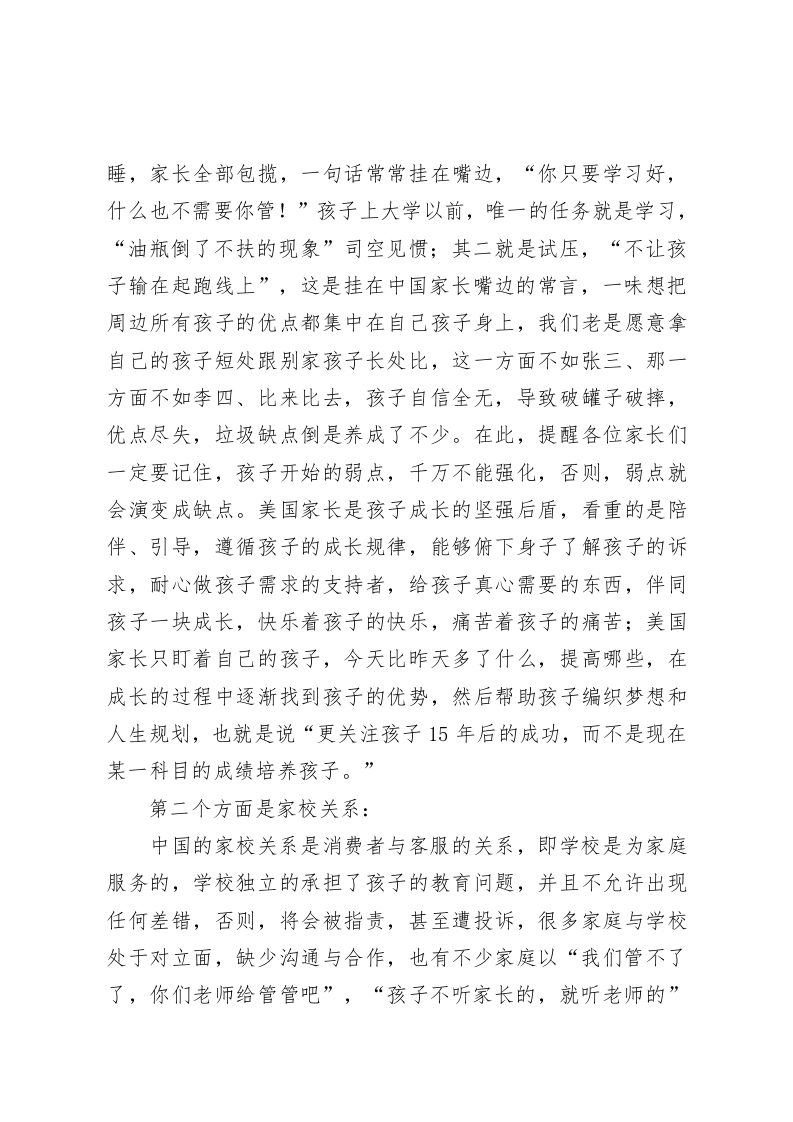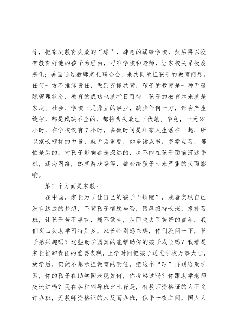 校长在家长会上发言家长们也应该更新观念,跟上学校发展的步伐,和孩子一同成长尊敬的贵家长:上午好!欢迎您的到来,因为班级太多,只能采取视频讲话的方式与您交流,希望得到您的理解,您的到来是对学校和班级工作最大的支持,我代表全校师生对您表示衷心的感谢!Xx小学,合班并校半年有余,现有教师125人,在校生1633名。目前,全校师生在学校文化体系的引领下,正在健康成长!全校上下,风清气正,时时、处处都散发着正能量,在您的关心和支持下,我坚信不久的将来,一所高品质的学校,将巍然而立!前几天,接受了上级交给我一项任务,针对《中美教育最全对比,从未如此惊心》的图解,把中国教育和美国教育做文字解读,以期让我们的教育有更好的发展,其中感触最深的是家庭教育在孩子的成长过程中重要性。在座的家长,多数是具有一定文化基础的年轻人,所以应该了解一些发达国家的教育,与国际接轨,与未来对话。下面选取几个方面供家长们借鉴,鉴于中国的国情,可能有所偏颇,还望得到您的进一步理解和支持!第一个方面是家长职责:中国家长的职责主要有二、其一是呵护,孩子的吃喝拉撒