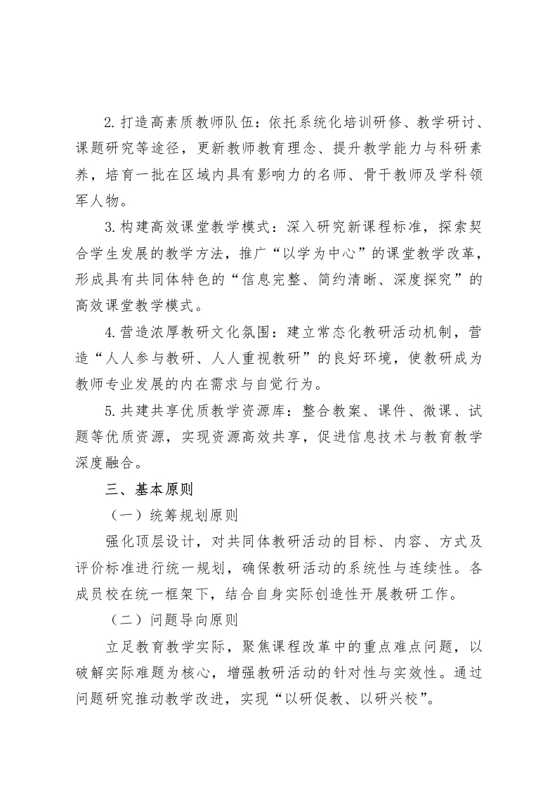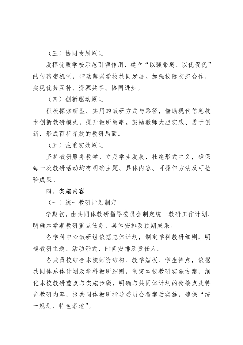 学校发展共同体统一教研活动实施方案(2025年修订)一、指导思想深入贯彻党的教育方针,全面落实立德树人根本任务,积极响应《关于深化教育教学改革全面提高义务教育质量的意见》精神,以推动区域教育优质均衡发展为核心,构建资源共享、优势互补、共同提高的教育发展新格局。在深入研读《义务教育课程方案和课程标准(2022年版)》的基础上,结合我县教育发展实际,秉持“共建、共享、共赢”原则,以提升教师专业素养为核心,以深化课堂教学改革为重点,以完善教研体系建设为保障,通过健全共同体学校统一教研机制,实现教研活动规范化、科学化、实效化,全面提升共同体学校教育教学质量,努力办好人民满意的教育,特制定本实施方案。二、工作目标(一)总体目标构建覆盖共同体所有成员校的统一教研体系,实现“理念共融、资源共享、研训共促、质量共进”。通过三年持续推进,推动共同体各学校教研水平整体提升、教师专业化能力显著增强、学生全面发展成效凸显,区域教育质量得到明显改善。(二)具体目标1.健全教研组织体系:成立共同体教研指导委员会,设立学科中心教研组,完善校际教研网络,构建“纵横交错、上下联动”的教研组织架构,保障教研活动有序高效开展。