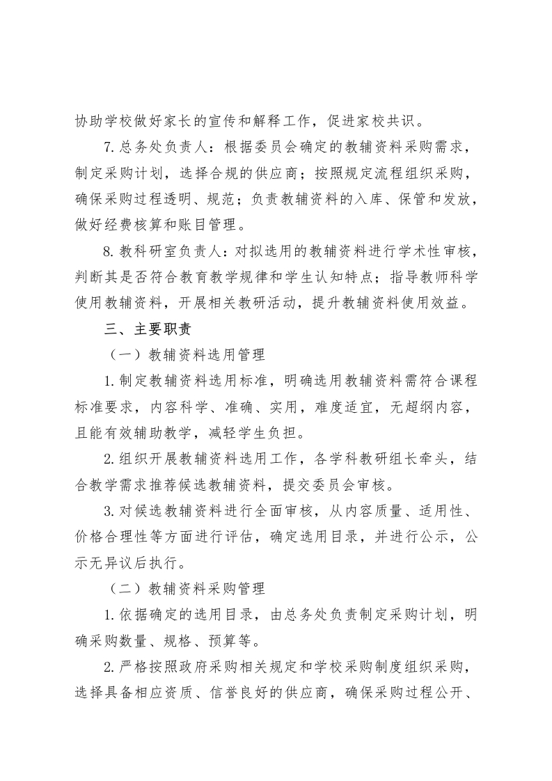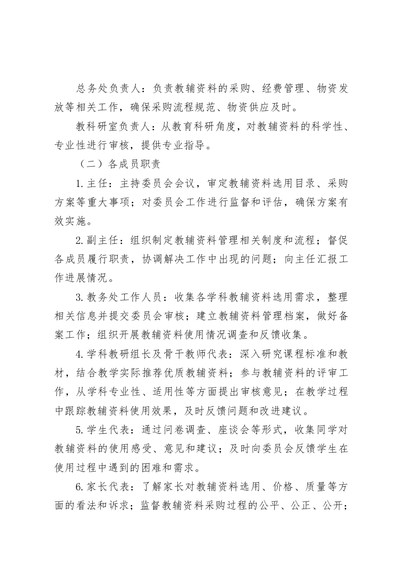 学校教辅选用管理委员会成立方案一、指导思想以立德树人根本任务为引领,全面贯彻国家教育方针及“双减”政策要求,坚持以学生发展为中心,规范学校教辅资料的选用、采购、使用与监管等环节,减轻学生过重课业负担和家长经济负担,提升教辅资料质量,服务教育教学工作,促进学校教育教学高质量发展。二、组织机构及职责(一)委员会组成1.主任:校长或分管教学副校长,全面统筹委员会各项工作,审批重要决策和方案。2.副主任:教务处主任,协助主任开展工作,协调各部门及成员间的沟通与协作,落实具体工作安排。3.成员:教务处工作人员:负责教辅资料管理的日常事务,如资料收集、整理、备案,组织相关会议等。各学科教研组长及骨干教师代表:结合学科教学实际,提出教辅资料选用建议,参与教辅资料审核,反馈教学使用情况。学生代表:从学生使用角度出发,反馈教辅资料的适用性、难度等情况,反映学生需求和意见。家长代表:代表家长监督教辅资料的选用、价格等情况,提出合理建议,加强家校沟通。