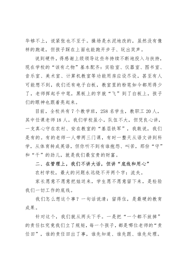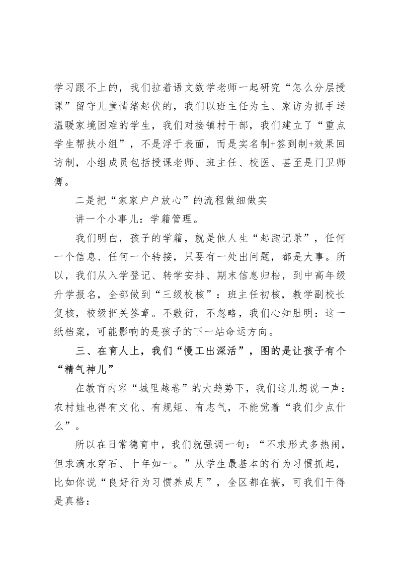 学校义务教育优质均衡创建,校长汇报:搞成这样我是既兴奋又忐忑尊敬的各位领导、各位专家、各位同仁:大家好!今天能有机会站在这里向大家汇报我们学校在优质均衡发展方面的一些具体做法和探索经验,我既高兴也坦诚说,心里多少有些忐忑。高兴的是,在百忙之中,大家抽出时间专程来到我们这所带着泥土气息的农村小学,为我们“把脉问诊”:忐忑的是,这几年虽然我们在不停地干,但真要和一些基础条件更好、资源更优的学校比,我们还是觉得差距不小,压力不小,步子也不敢松。但也正因为如此,我更想借这个机会,说说我们在有限条件下,是怎么做工作的,这些年又是如何边走、边摔、边想办法,一步步往前挪的。汇报不比成绩单,更像一次“家丑不怕外扬”的“互看互学”,做到哪儿就说哪儿,盼望在座的领导和专家能多提意见、多给药方,帮我们把接下来的路走得更实更稳。一、先请大家了解一下我们的“家底”我们学校,其实历史不算短。从建校算起,已经有三十多年。原来是镇里的一所小学,小而全,如今搬迁到现在的位置后,更像是一个“区域中心点校”,服务着周边七个自然村的孩子。占地大概1.6万平方米,建筑面积近1500平方米,说豪