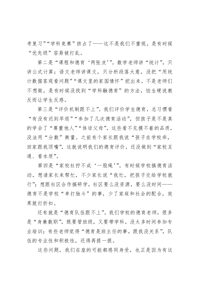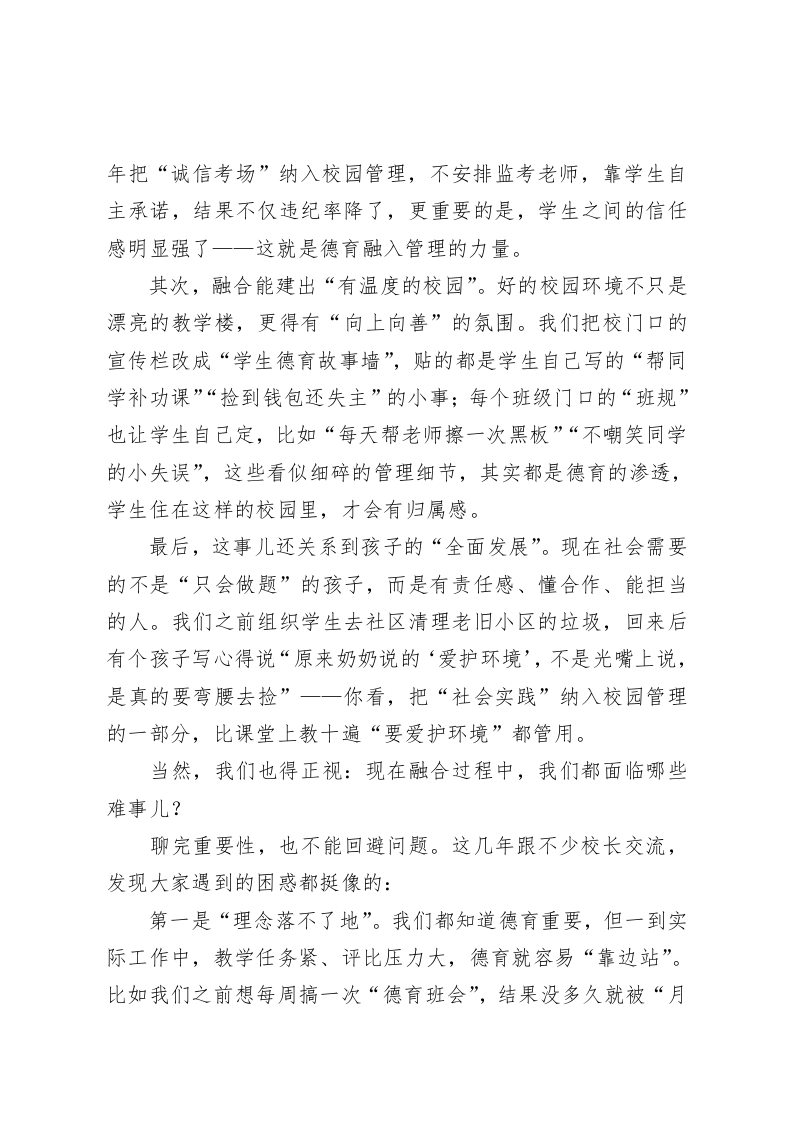 以德育为魂,优管理之效—一初中学校德育与管理融合的实践探索尊敬的各位教育同仁、各位校长朋友:大家上午好!今天能和各位齐聚一堂,探讨学校管理的核心议题,我特别荣幸。我们做初中教育的都清楚,初中阶段是孩子三观成型、品行养成的“关键期”,就像一棵小树,既要浇水施肥(抓知识教学),更要扶直枝干(抓德育培养)。这些年,我们学校一直在摸索“把德育融进校园建设管理每一个角落”的路径,今天也想把一些实践思考和困惑,跟大家做个交流,希望能抛砖引玉,也听听各位的好经验。先跟大家聊聊:为啥“建设管理+德育”的融合,对初中校这么重要?在我们日常办学里,可能都遇到过这样的情况:校园设施建得再先进,要是学生没养成爱护公物的习惯,课桌椅没多久就被刻划;制度定得再细,要是没让学生明白“规则背后是尊重”,遵守纪律也成了“怕被扣分”的被动服从。这其实就说明,德育不是“单独开几节思政课”的事,而是要跟学校的建设管理拧成一股绳。首先,德育是学校管理的“灵魂”。我们常说“立德树人”,要是管理只盯着“升学率”“平均分”,忽略了孩子的品行培养,就算成绩上去了,孩子走上社会也可能“走偏”。我们学校这两