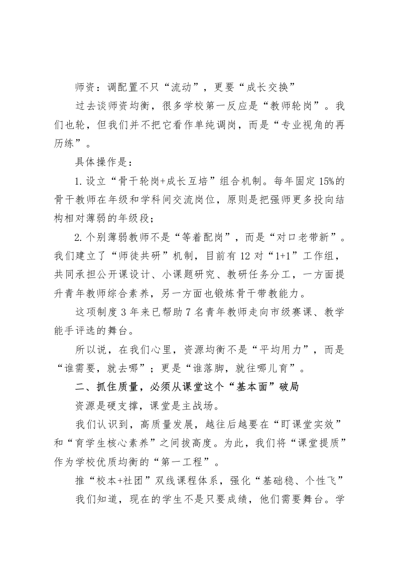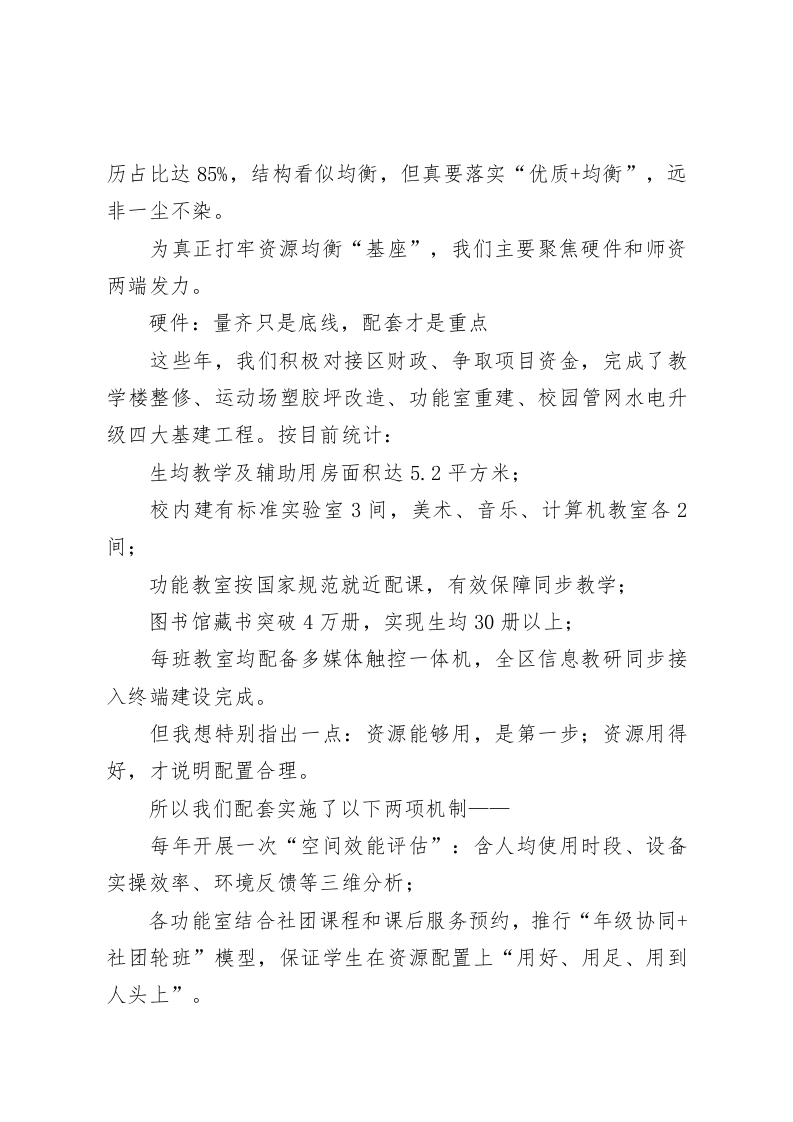 优质均衡不是终点,而是起点一一校长在现场交流会上深度发言,引发现场共鸣尊敬的各位领导、各位教育同仁:大家上午好!非常感谢各位莅临指导,我受学校委托,就我校近年来在推进优质均衡发展方面的一些做法和思考,作一个汇报发言。首先,请允许我代表学校全体师生,对您们的到来表示最热烈的欢迎和最诚挚的感谢!我们知道,“优质均衡”这四个字,说来干净精炼,真正做起来,却是条需要长期苦修、步步扎根的实干之路。它背后是教育公平的使命诉求,也是我们作为一名基层办学者、管理者,面对家长期待、学生成长、社会责任三重拉力下,必须交出的答卷。今天的汇报不谈“造词项目”,不飙“数字成果”,我更想从“这所学校如何从地方实际往里深挖、往上拔高”的角度,把我们扎实推进优质均衡过程中的关键动作和一些反思呈现给各位领导和同仁。一、走向均衡,首在资源配置要“科学按需”、而不是“齐而不精”我们这所学校,是一所创建于1985年的老校,位处城区边缘地带,全校目前30个教学班,在校学生1350人,在岗教职工92名,专任教师80名,100%持教师资格证,本科及以上学