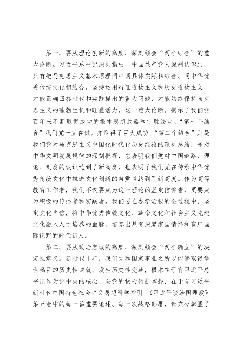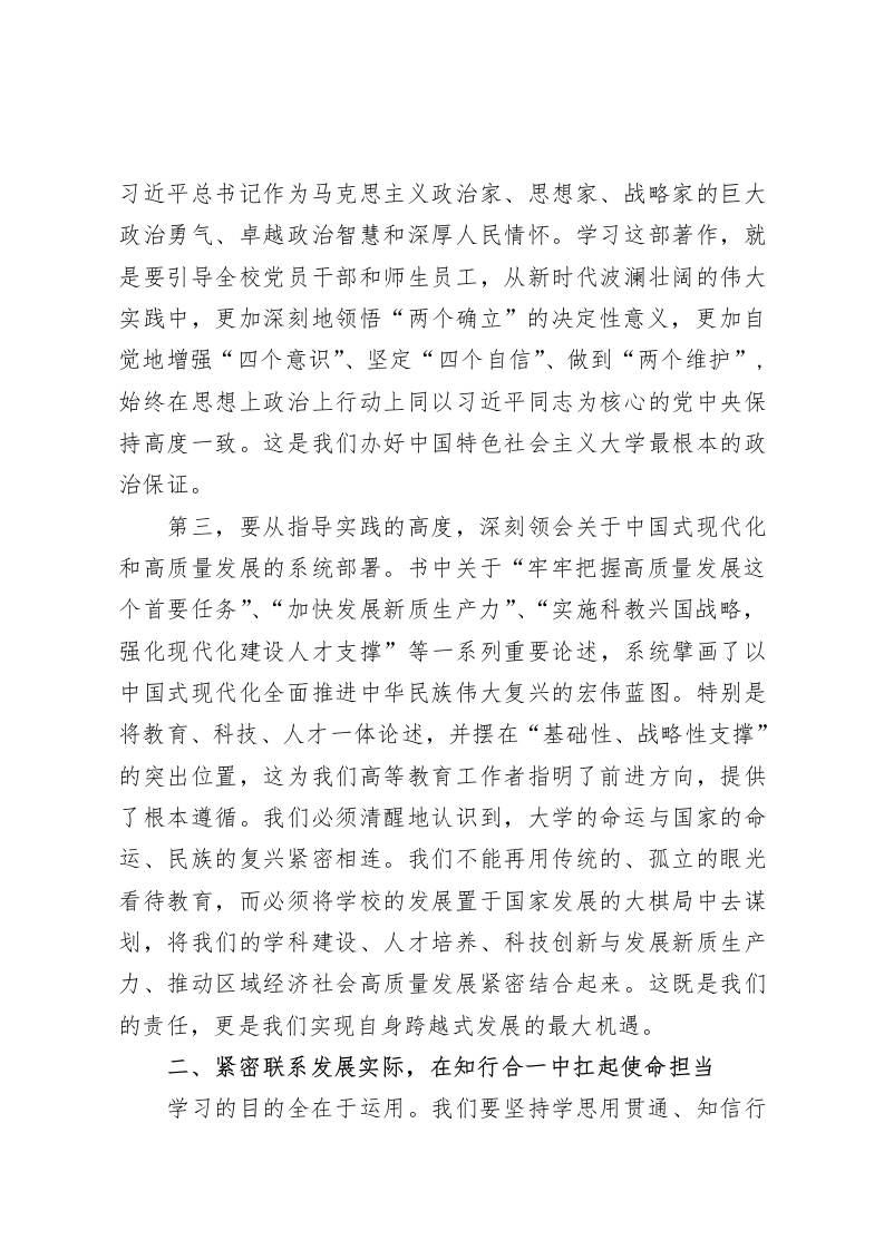 在XX大学2025年第6次党委理论学习中心组专题学习会议上的讲话(精品)同志们今天,我们召开学校党委理论学习中心组专题学习会议,集中学习研讨《习近平谈治国理政》第五卷。这是一次十分重要的理论学习和思想武装。在全党深入开展学习贯彻习近平新时代中国特色社会主义思想主题教育的背景下,在全校上下奋力推进高质量发展的关键时期,系统学习、深刻领会这部纲领性文献,对于我们统一思想、统一意志、统一行动,在新征程上不断开创学校事业发展新局面,具有极其重要的现实意义和深远的历史意义。刚才,几位同志结合分管工作和学习体会,作了很好的交流发言,听了很受启发。大家准备充分、思考深入,谈认识、讲体会、谋思路,体现了理论学习的深度和对学校事业发展的责任感。下面,结合我的学习思考,和同志们交流几点意见。一、深刻领会重大意义,在深学细悟中筑牢思想根基《习近平谈治国理政》第五卷,生动记录了以习近平同志为核心的党中央在2022年10月至2024年10月期间,团结带领全党全国各族人民奋进新征程、建功新时代的伟大实践,是全面系统反映习近平新时代中国特色社会主义思想最新发展的权威著作。学习这部著作,我们必须站在时代和全局的高度,深刻把握其核心要义与精神实质。