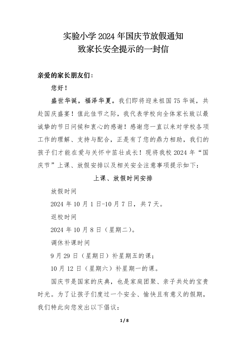 实验小学2024年国庆节放假通知致家长安全提示的一封信亲爱的家长朋友们:您好!盛世华诞,福泽华夏。我们即将迎来祖国75华诞,共赴国庆盛宴!值此佳节之际,我代表学校向全体家长致以最诚挚的节日问候和衷心的感谢!感谢您一直以来对学校各项工作的理解、支持与配合,正是有了您的鼎力相助,我们的孩子们才能在爱与关怀中茁壮成长!现将我校2024年“国庆节”上课、放假安排以及相关安全注意事项提示如下:上课、放假时间安排放假时间2024年10月1日-10月7日,共7天。返校时间2024年10月8日(星期二)。调休补课时间9月29日(星期日)补星期五的课:10月12日(星期六)补星期一的课。国庆节是国家的庆典,也是家庭团聚、亲子共处的宝贵时光。为了让孩子们度过一个安全、愉快且有意义的假期,我们特此向您发出以下倡议:1/8