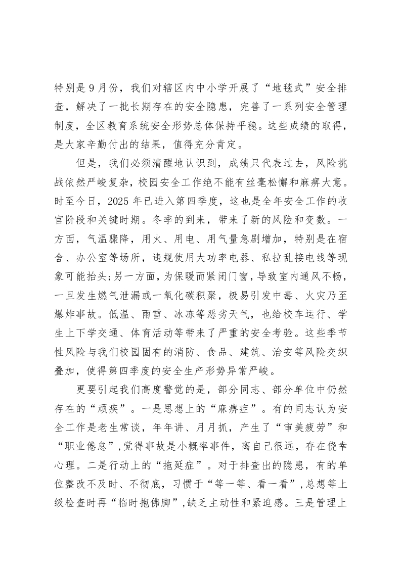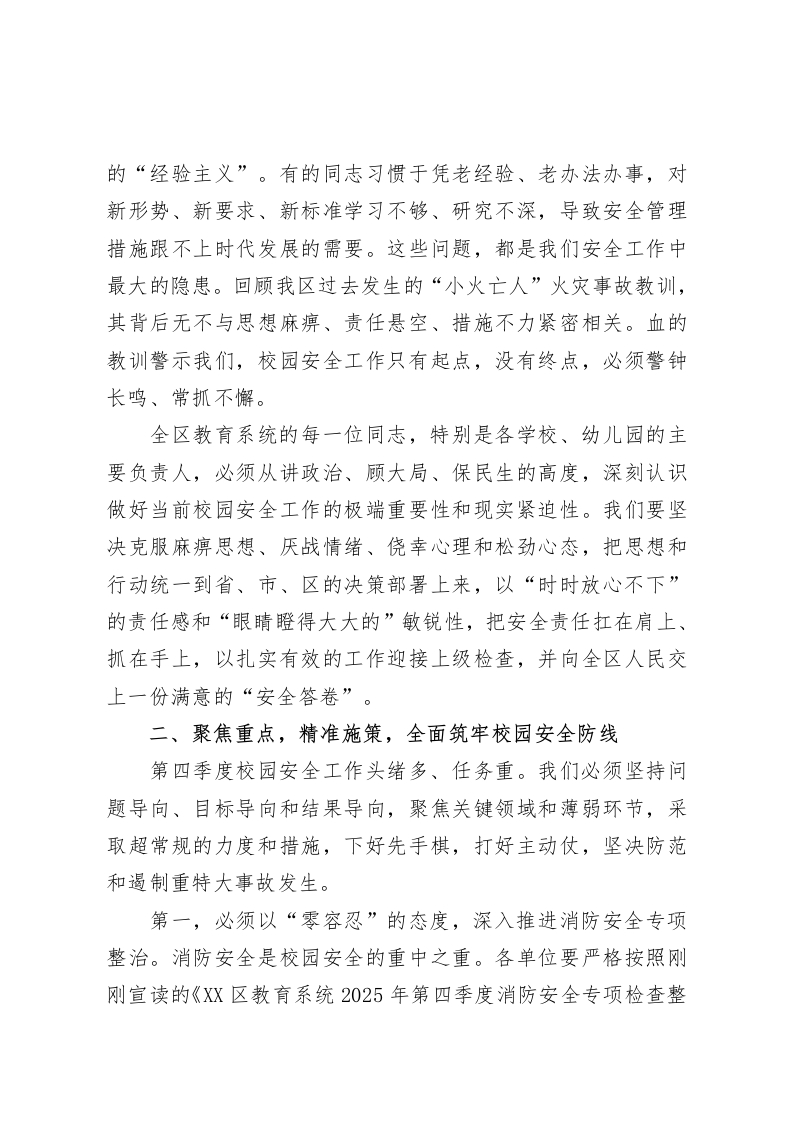 在XX区教育系统2025年第四季度安全工作会议上的讲话(精品)同志们:大家上午好。今天,我们在这里召开全区教育系统2025年第四季度安全工作会议,主要任务是深入贯彻落实全省消防安全集中整治工作会议精神与省校园安全工作动员部署会议的核心要求,全面分析当前我区教育系统面临的安全形势,安排部署第四季度及今后一个时期的校园安全重点工作,以最高标准、最严要求、最实举措,迎接即将到来的上级检查,为全区教育事业的高质量发展筑牢坚实的安全防线。刚才,我宣读了《XX区教育系统2025年第四季度消防安全专项检查整治工作方案》,XX局长也传达了市、区两级重要会议精神并强调了重点任务,希望大家深刻领会,认真抓好贯彻落实。下面,结合我区实际,我再讲三点意见。一、认清形势,正视挑战,深刻把握校园安全的极端重要性安全是发展的前提,稳定是改革的基石。对于教育系统而言,校园安全是底线,更是生命线,直接关系到广大师生的生命财产安全,关系到千家万户的幸福安宁,关系到整个社会的和谐稳定。今年以来,在区委、区政府的坚强领导下,在全区教育同仁的共同努力下,我们持续推进校园安全专项整治三年行动,深入开展了多轮次、全覆盖的安全隐患排查整治行动,