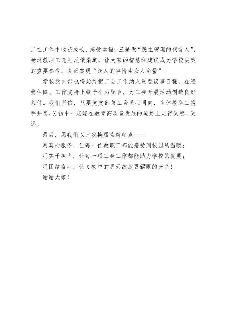 在X初中工会换届选举大会上的讲话各位老师、同志们:“弦歌不辍,薪火相传”。今天,我们齐聚一堂,共同见证X初中工会换届选举圆满完成。此次大会严格遵循选举程序,民主选出了新一届工会委员会,这既是学校民主政治生活的一件大事,更是凝聚全体教职工力量、共谋学校发展的重要契机。在此,我代表学校党支部,向新当选的工会委员表示热烈祝贺,也向为学校发展辛勤付出的全体教职工,以及上一届工会委员会的同志们致以衷心感谢!过去几年,上一届工会始终围绕学校中心工作,把“服务教职工、凝聚向心力”作为核心使命。无论是疫情期间为大家采购防疫物资,开展核酸检测,还是常态化开展的春节慰问、大病慰问、红白喜事的组织、教职工体检,都让“家”的温暖浸润在校园每个角落。正是这份“想教职工之所想、急教职工之所急”的担当,为学校稳定发展筑牢了坚实的群众基础。新一届工会委员会接过的,不仅是一份工作责任,更是全体教职工的信任与期待。未来,希望新一届工会能做好“三个表率”:一是做“服务师生的贴心人”,深入教室、办公室倾听大家的心声,把教职工的困难当作自己的事情,让工会成为大家可信赖的“避风港”;二是做“学校发展的助推者”,围绕“提升教学质量、培育时代新人、推动优质均衡发展”的目标,组织更多有温度、有实效的教研活动、文体活动,让教职