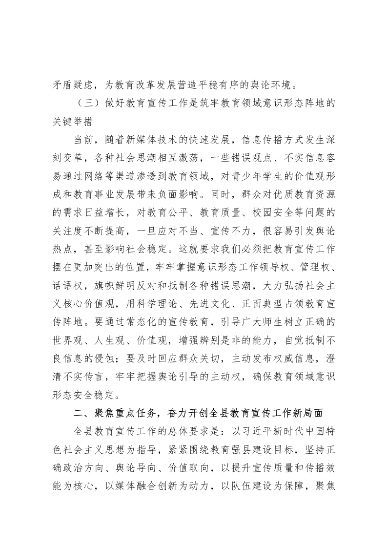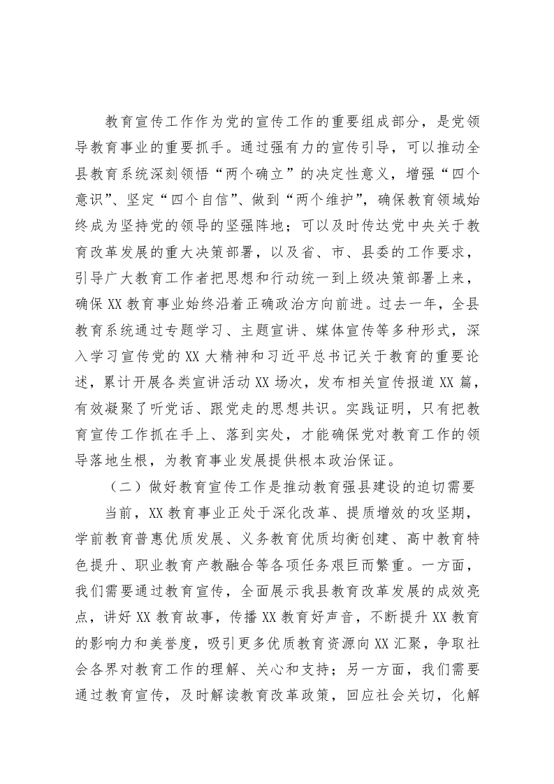在全县教育宜传暨教育报刊杂志征订工作会上的讲话同志们:今天,我们在这里召开全县教育宣传暨教育报刊杂志征订工作会议,主要任务是深入学习贯彻习近平总书记关于宣传思想工作的重要思想和关于教育的重要论述,全面落实中央、省、市关于宣传思想和教育工作的决策部署,总结过去一段时间全县教育宣传工作成效,分析当前面临的形势与任务,安排部署下阶段教育宣传重点工作和教育报刊杂志征订工作,进一步统一思想、凝聚共识、真抓实干,为加快推进教育强县建设、谱写XX教育高质量发展新篇章提供坚强的思想保证。刚才,相关股室就具体工作进行了安排,讲得很具体、很到位,希望大家认真抓好落实。下面,我讲几点意见。一、提高政治站位,深刻认识新时代教育宣传工作的极端重要性教育领域是意识形态工作的前沿阵地,教育宣传工作事关党的教育方针政策的贯彻落实,事关教育改革发展的大局稳定,事关全社会对教育事业的认知认同。站在新的历史起点上,我们必须从政治和全局的高度,深刻把握教育宣传工作的时代意义,切实增强做好工作的责任感、使命感和紧迫感。(一)做好教育宣传工作是坚持党对教育工作全面领导的必然要求