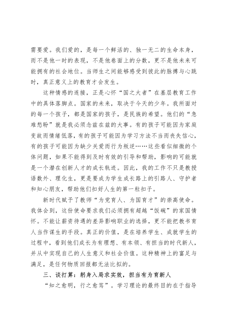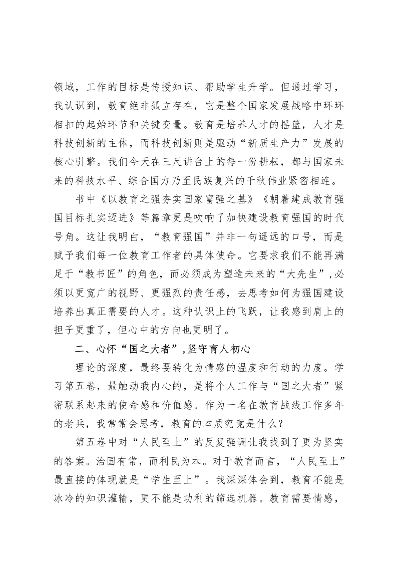 中学老师学习《习近平谈治国理政》第五卷心得体会时值金秋,丹桂飘香。2025年9月,我们迎来了《习近平谈治国理政》第五卷的正式出版发行。作为一名身处XX县XX初中的教育工作者,我在第一时间拜读了这部思想深邃、内涵丰富的鸿篇巨著。展卷披读,心潮澎湃,字里行间蕴含的真理力量与实践伟力,如同一座思想的灯塔,照亮了前行的道路;又如同一泓清泉,滋润着我作为一名人民教师的初心。这部著作系统收录了2022年5月至2024年12月期间的系列重要论述集中反映了新时代新征程上,我们党治国理政的最新理论成果。结合我个人的工作实际,浅谈几点粗浅的认识、体会与打算。一、从“人民至上”到“三位一体”的深邃洞见学习的过程,是一个不断深化认识、提升站位的过程。从第四卷到第五卷,我深刻感受到党的创新理论既一脉相承又与时俱进的鲜明品格。如果说“人民至上”是贯穿始终的价值底色和根本立场那么第五卷中提出的新思想新论断,则为这一根本立场在新的历史条件下的实践,提供了更为具体的科学指引。我感触最深的,是书中“一体推进教育科技人才事业发展”这一全新专题。总书记深刻指出,教育、科技、人才是全面建设社会主义现代化国家的基础性、战略性支撑。这一“三位一体”的系统性论述,让我对教育工作的认识提升到了一个前所未有的战略高度。过去,我或许更多地将教育视为一个独立的