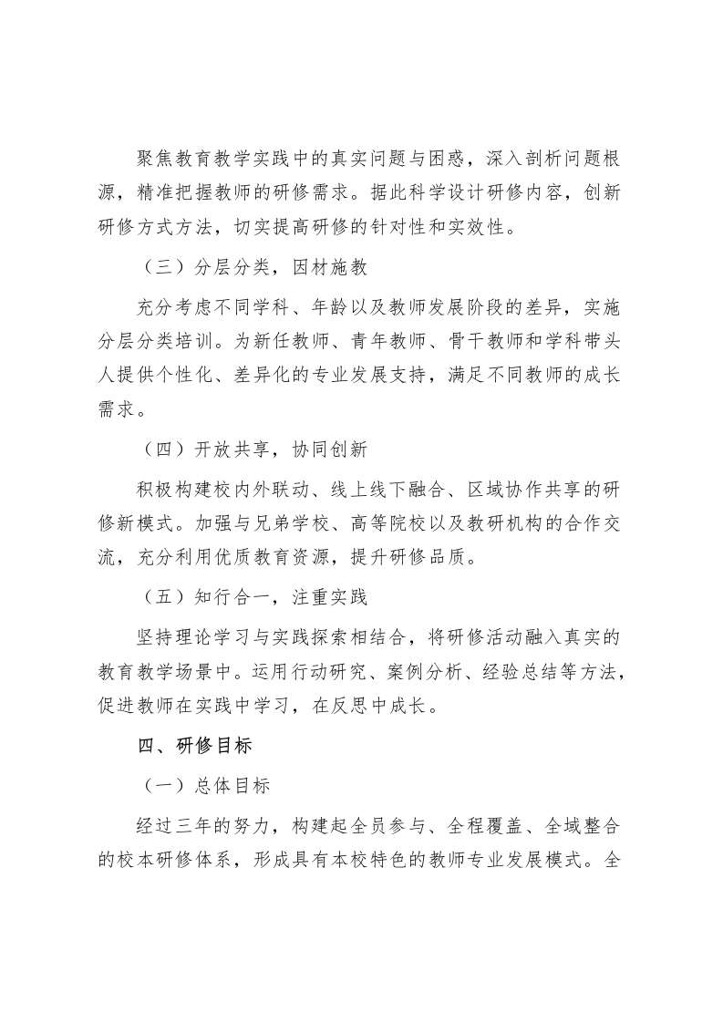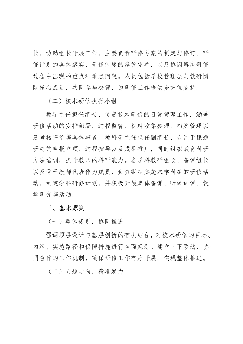 2025-2026学年校本研修实施方案在教育强国战略全面推进的时代背景下,高质量教育体系的建设成为教育领域的核心任务。而校本研修工作,作为提升教师专业素养、推动教育教学质量提升的关键环节,对于学校的长远发展和学生的全面成长具有不可替代的重要意义。为积极响应党的教育方针,切实落实立德树人的根本任务,结合本校实际情况与发展需求,特制定本校本研修工作方案。一、核心理念秉持教育创新发展的理念,以深化教育评价改革为契机,将提升教师核心素养作为主线,紧密围绕教育教学中的实际问题,以促进学生全面发展为根本目标。通过系统规划、精准施策与机制创新,全方位推动教师专业化成长,打造一支师德高尚、业务精湛、结构合理且充满活力的高素质专业化创新型教师队伍,为学校实现高质量发展筑牢师资根基,提供强大的智力支持。二、组织架构与职责(一)校本研修领导小组由校长担任组长,全面负责校本研修工作的顶层设计、整体规划、资源调配、过程把控以及效果评估,确保研修工作的系统性、科学性与实效性。教学副校长与德育副校长担任副组