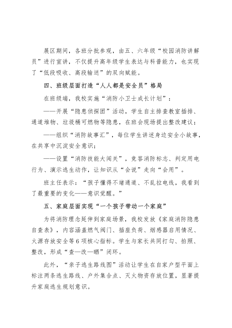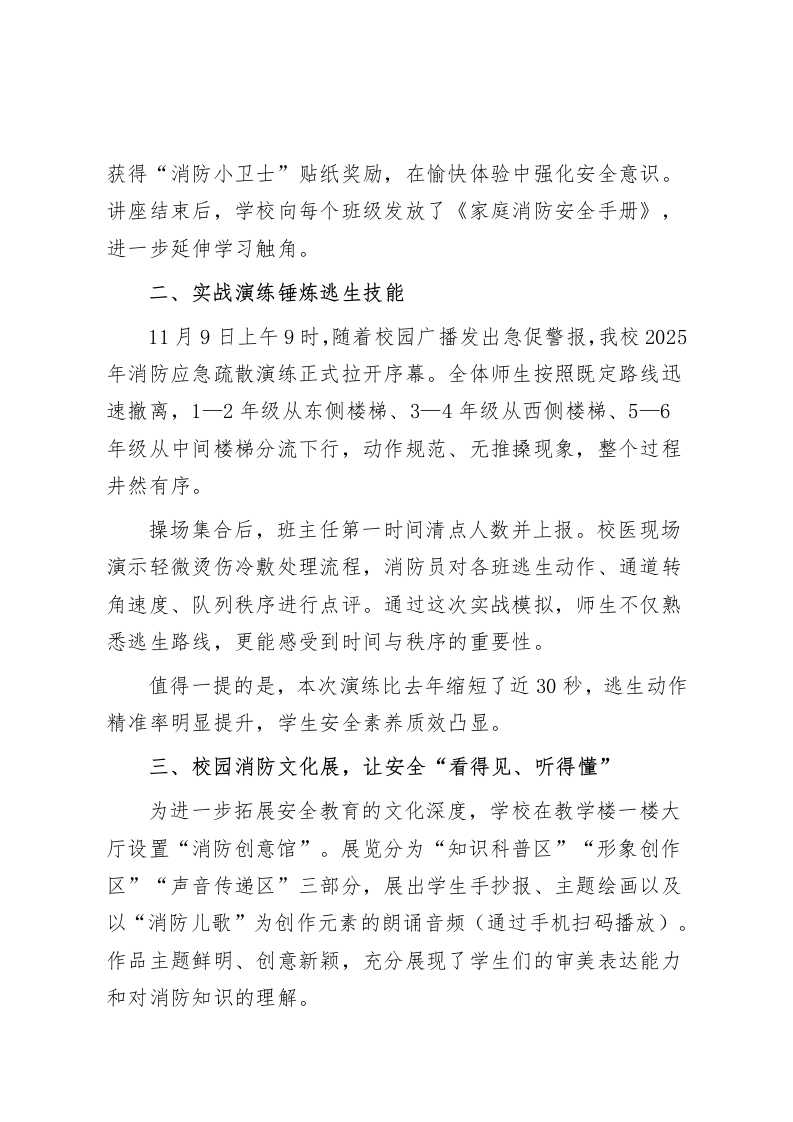 2025年消防安全月系列活动通讯稿:全民消防、生命至上全民消防、生命至上我校开展2025年消防安全月系列活动为贯彻落实第34个全国消防日活动精神,深入推进校园安全教育体系建设,全面提升师生消防安全意识和自护自救能力,2025年11月,我校以“全民消防、生命至上一一安全用火用电”为主题,开展了覆盖全校、全流程、多维度的消防宣传月系列活动。通过“全景课堂、实战演练、隐患排查、家校联动、文化浸润”等五大板块,形成了“学、练、查、纠、演、评”六环节闭环式安全教育体系,进一步筑牢校园消防安全防线。一、专题讲座开启消防学习第一课11月4日下午,我校邀请辖区消防救援站两名消防员走进校园,为师生开设“消防知识‘童’行讲堂”。讲座从小学生常见的用火用电误区切入,通过动画短片、典型案例、仿真模型演示等方式,让学生在轻松、生动的氛围中掌握灭火器使用方法、“逃生毯”正确展开姿势、火场中“捂口鼻一低姿走一就近撤”的关键动作。现场互动环节尤为热烈,学生们积极抢答“电器起火能不能泼水?”“发现火情首先拨打什么号码?”等知识点,纷纷