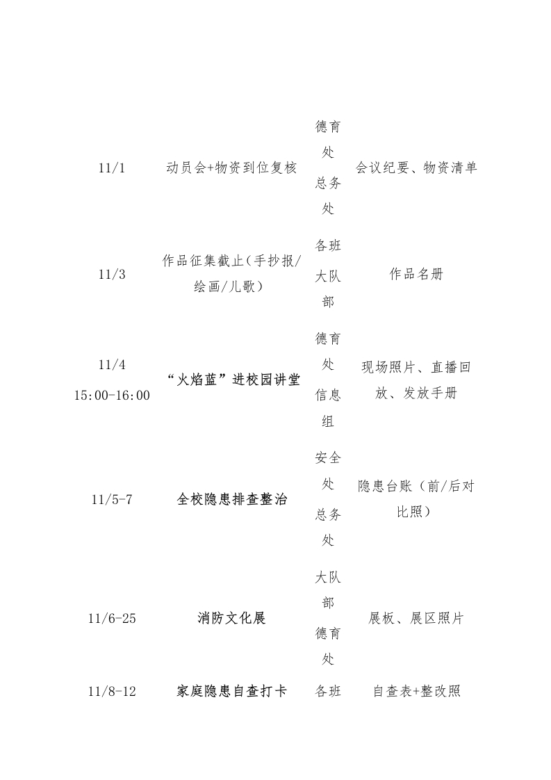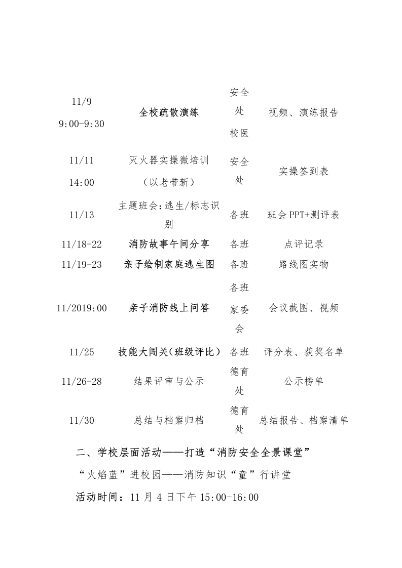 2025年消防宣传月活动实施方案主题:全民消防、生命至上一一安全用火用电周期:2025年11月1日一11月30日2025年11月9日是第34个全国消防日,进一步加强学生消防安全意识,提升自护自救能力,强化家庭安全用火用电规范行为,营造“人人讲安全、个个会逃生”的校园氛围,学校以“趣味化、场景化、参与式”为路径,构建“校园一家庭一社区”三位一体的消防安全防线。结合学校实际,特制定本实施方案。一、活动目标1.学校层面:建立常态化校园消防安全教育体系。2.学生层面:学生掌握“用火用电安全禁忌”“火场逃生3个关键动作”“消防标志识别”等基础内容。3.家庭层面:培养学生“主动排查隐患”的意识,带动家庭完成1次消防隐患自查;实现“1名学生带动1个家庭”,提升家校联动的消防应急能力。二、总体日程安排责任日期事项材料内容人