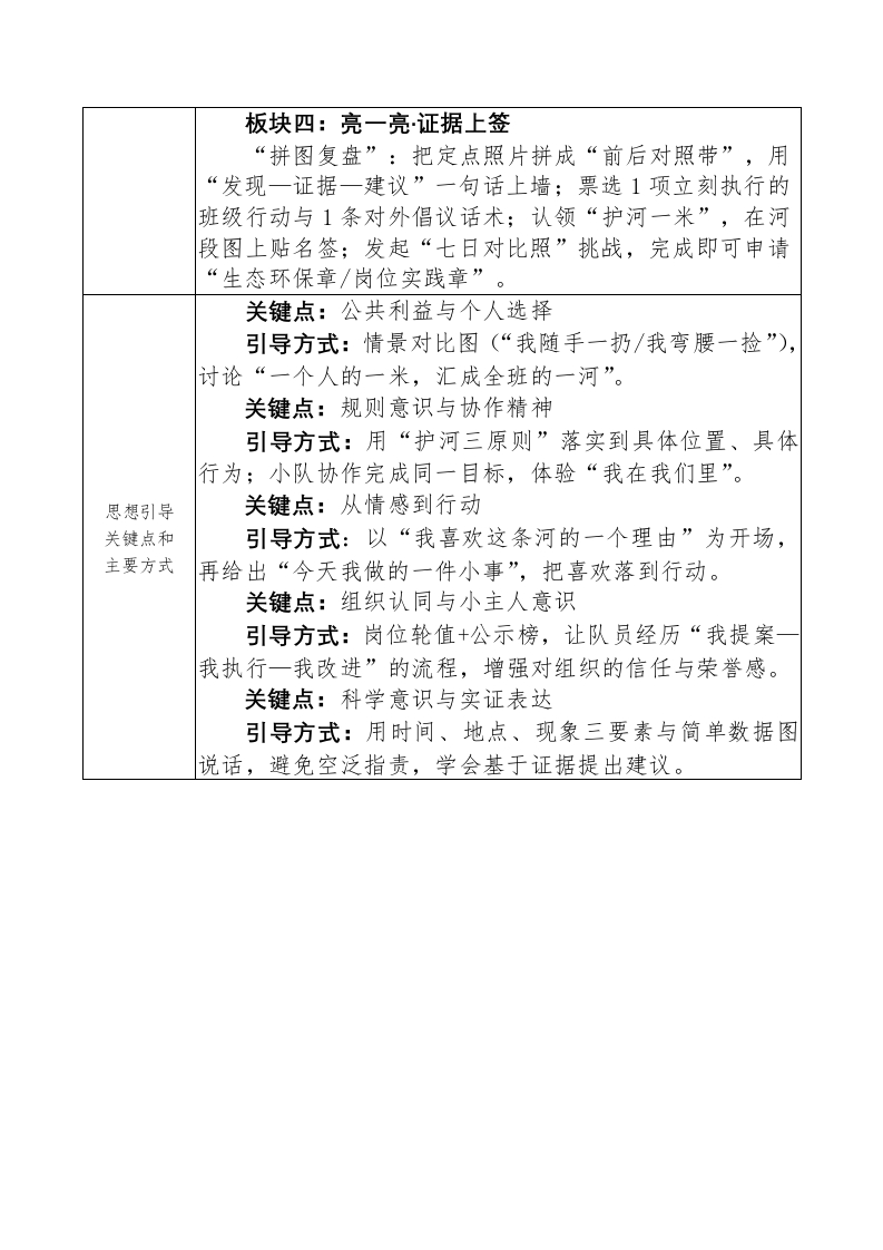 2025年优质少先队活动课案例推荐表3.活动课信息活动课主题“河”你为家乡添一蓝课时2课时☑学校课堂口校内其他场所口青少年宫活动课地点☑社区☑校外实践教育营地(基地)口校外其他企事业单位、部队等政治认知:认识“节水护河、珍爱生态”是每位公民应尽职责;明白公共环境治理需要规则与协作,懂得个体行为与集体利益相连。政治情感:在观察与巡河中爱上家乡河流,形成对家活动课目标园的自豪与责任,愿为“清澈一河”出一份力。政治意识:愿意遵守公共秩序与环保规范,主动参与“护河一米”志愿行动,用实际行动带动同伴与家人,起做“红领巾小河长”。学校附近有一条小河,通向更大的江海。近阶段,岸边偶见白色垃圾、随手投喂、踩踏绿地等问题。孩子们常在河边活动,对“河为什么会变脏”“我们能做什么”充满好奇却缺少科学、系统的认识。基于“从身边出发、在实践中成长”的活动课程理念,本课以“小河一江一海”的流域视角,帮助队员建立整体观每一条小河都与远方的江海相连。背景分析学情方面三一六年级队员具备基本观察、记录、表达能力,乐于参与岗位体验,但对“公共事务”的规则意识、与人沟通方法仍需练习。为此,本课设计“看见问题一共定规范一岗位巡河一证据回看一倡议争章”的闭环,让价值在真实情境中发生。活动坚持“小而真、轻而实”以积极叙述取代情绪指责,以合作行动代替空喊口号,促成日常里的稳定改变。一、少先队员准备:1.前置观察:完成《我眼中的这条河》速查卡(河段活动课准备位置/常见问题/人流高峰/野生动植物)。2.三小队分工: