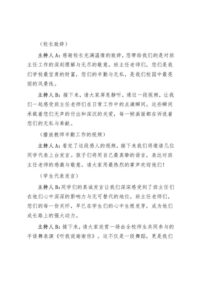 班主任节启动仪式主持词一一致敬校园“摆渡人”主持人A:“春风化雨,润物无声;桃李不言,下自成蹊。”尊敬的各位领导、亲爱的老师们、亲爱的同学们,大家上午好!今天,我们汇聚一堂,在这温暖的阳光下共同庆祝一个特殊的日子一一班主任节。在这充满感恩与敬意的时刻,我们向每一位班主任致以最崇高的敬意和最真挚的祝福。因为正是你们的付出,才有了学生们成长的希望,才有了校园中那一道道亮丽的风景线。主持人B:“细雨鱼儿出,微风燕子斜。”亲爱的班主任们,你们是孩子们心灵的守护者,是他们走向明天的指引者。在这个属于你们的节日里,我们怀着感激的心情,向每一位辛勤耕耘的班主任致以崇高的敬意,感谢你们在这片校园中留下的每一份汗水与心血。主持人A:班主任老师们,您们不仅是知识的传播者,更是每一位学生灵魂的塑造者。今天,我们为您们精心准备了这个特别的日子,希望借此机会,向您们表达我们深深的感恩与敬意。主持人B:接下来,让我们以最热烈的掌声,欢迎我们敬爱的校长上台致辞,为我们班主任节的庆祝活动开篇。