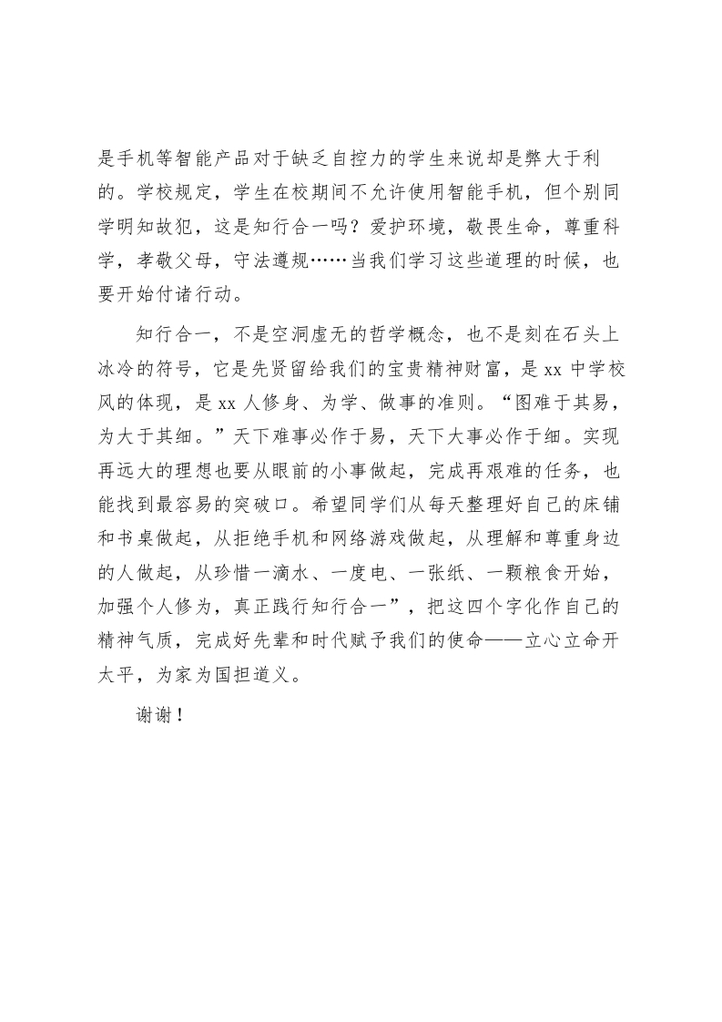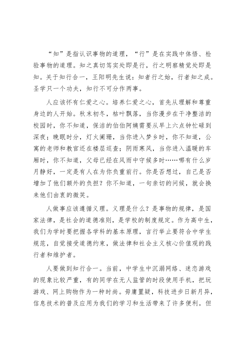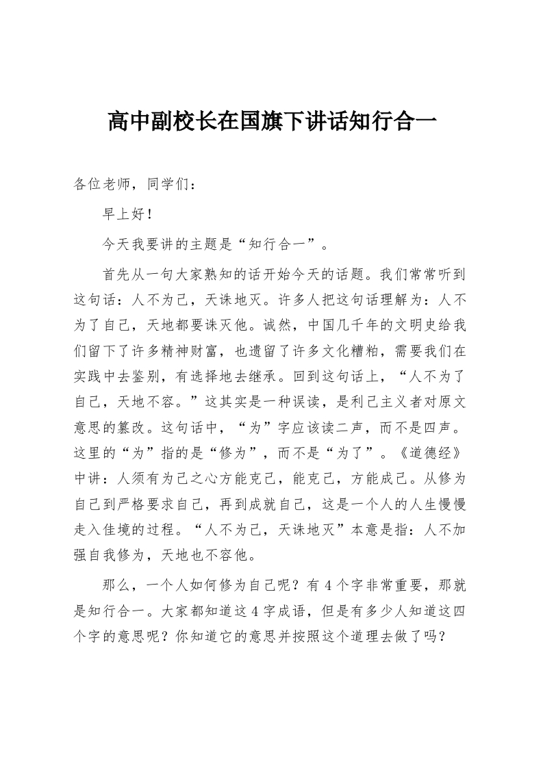 高中副校长在国旗下讲话知行合一各位老师,同学们:早上好!今天我要讲的主题是“知行合一”。首先从一句大家熟知的话开始今天的话题。我们常常听到这句话:人不为己,天诛地灭。许多人把这句话理解为:人不为了自己,天地都要诛灭他。诚然,中国几千年的文明史给我们留下了许多精神财富,也遗留了许多文化糟粕,需要我们在实践中去鉴别,有选择地去继承。回到这句话上,“人不为了自己,天地不容。”这其实是一种误读,是利己主义者对原文意思的篡改。这句话中,“为”字应该读二声,而不是四声。这里的“为”指的是“修为”,而不是“为了”。《道德经》中讲:人须有为己之心方能克己,能克己,方能成己。从修为自己到严格要求自己,再到成就自己,这是一个人的人生慢慢走入佳境的过程。“人不为己,天诛地灭”本意是指:人不加强自我修为,天地也不容他。那么,一个人如何修为自己呢?有4个字非常重要,那就是知行合一。大家都知道这4字成语,但是有多少人知道这四个字的意思呢?你知道它的意思并按照这个道理去做了吗?