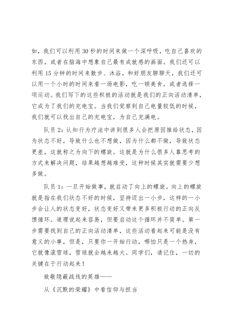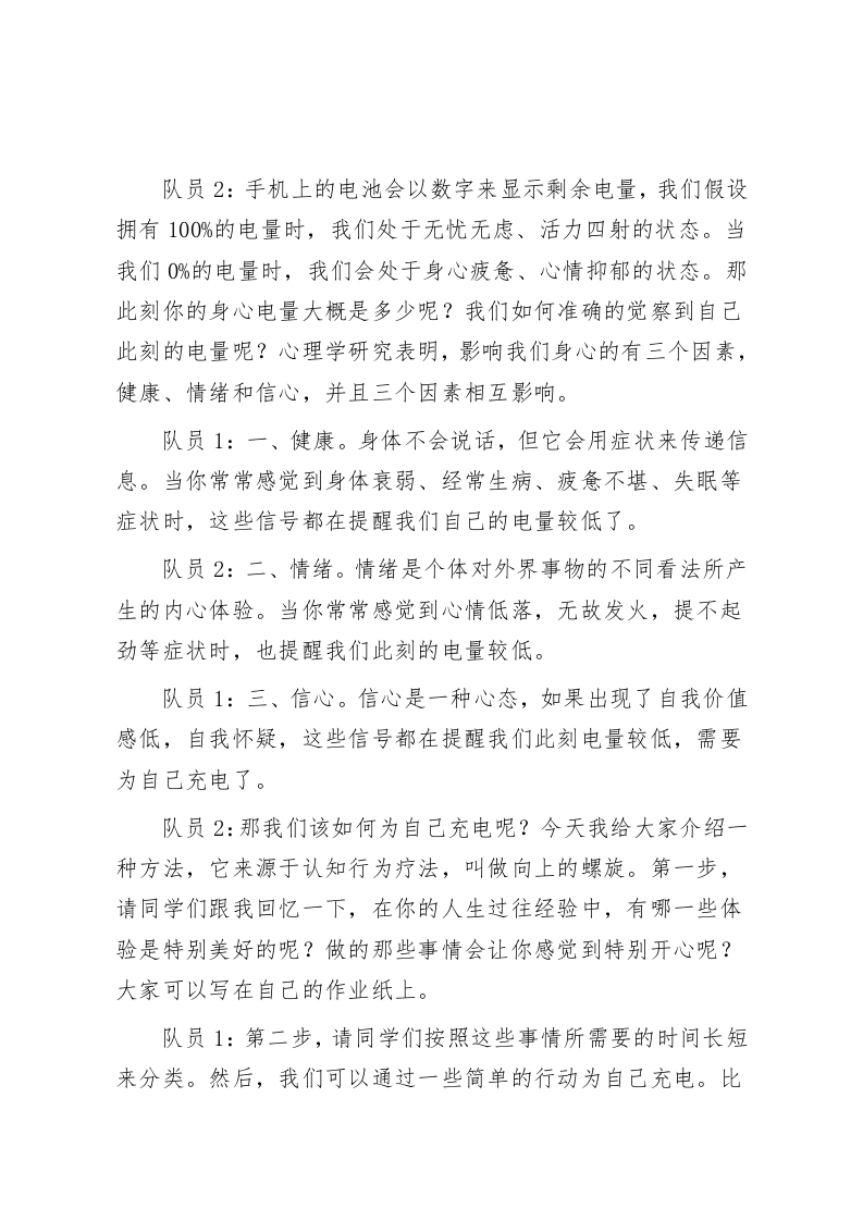 红领巾广播站2025年秋季学期第10周播稿心语心声专题广播《寻找我的“充电宝”》时间:2025年11月3日星期一地点:红领巾广播室播音员:队员1:敬爱的老师们:队员2:亲爱的同学们:合:大家早上好!队员2:唤醒你的耳朵,触摸你的心灵,用电波传递温暖,用声音传播正能量,红领巾广播站与你相约。让我们一起在广播中绽放光彩,书写美好校园篇章。队员1:今天,我们红领巾广播带来“心语心声”特别广播寻找我的“充电宝”。同学们,当手机电量亮红的时候,我们会立即去找到一个充电的插座,或者去找一个充电宝为它充电。其实我们也像一部手机,具备很多的功能,每天学习、社交、生活,我们肆意的发挥着自己的能量,其实能量也在一点点的消耗,那我们有为自己充电的习惯吗?