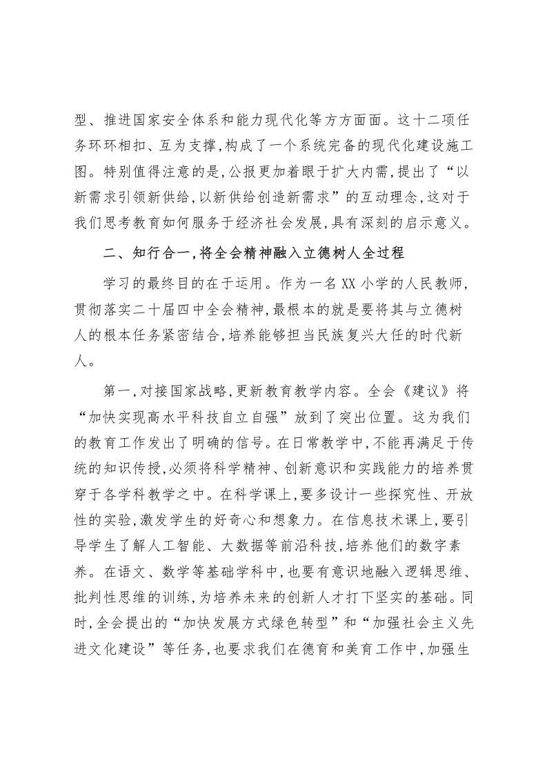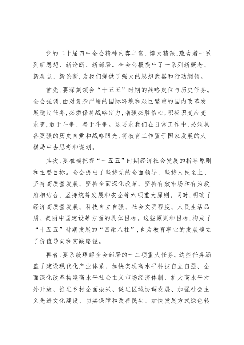 教师学习党的二十届四中全会精神心得体会金秋十月,举世瞩目的中国共产党第二十届中央委员会第四次全体会议在北京胜利闭幕。作为一名身处教育一线的普通党员教师,我怀着激动的心情,第一时间学习了全会公报全文并认真研读了会议审议通过的《中共中央关于制定国民经济和社会发展第十五个五年规划的建议》。这次全会是在中华人民共和国成立76周年之际,在向第二个百年奋斗目标进军的关键节点上召开的一次具有全局性、历史性意义的重要会议。全会公报高屋建瓴、思想深邃,为未来五年乃至更长时期国家的发展指明了前进方向、确立了行动指南。全会深刻指出,“十五五”时期是基本实现社会主义现代化夯实基础、全面发力的关键时期,具有承前启后的重要地位。这一重要论断,清晰标定了未来五年在中华民族伟大复兴历史进程中的关键坐标。学习全会精神,犹如登高望远,国家的宏伟蓝图与个人的奋斗足迹在时空的交汇点上激荡共鸣。作为一名人民教师,我深感使命光荣,责任重大,必须将全会精神内化于心、外化于行,将其转化为推动教育高质量发展的生动实践。一、深学细悟,准确把握全会精神的核心要义