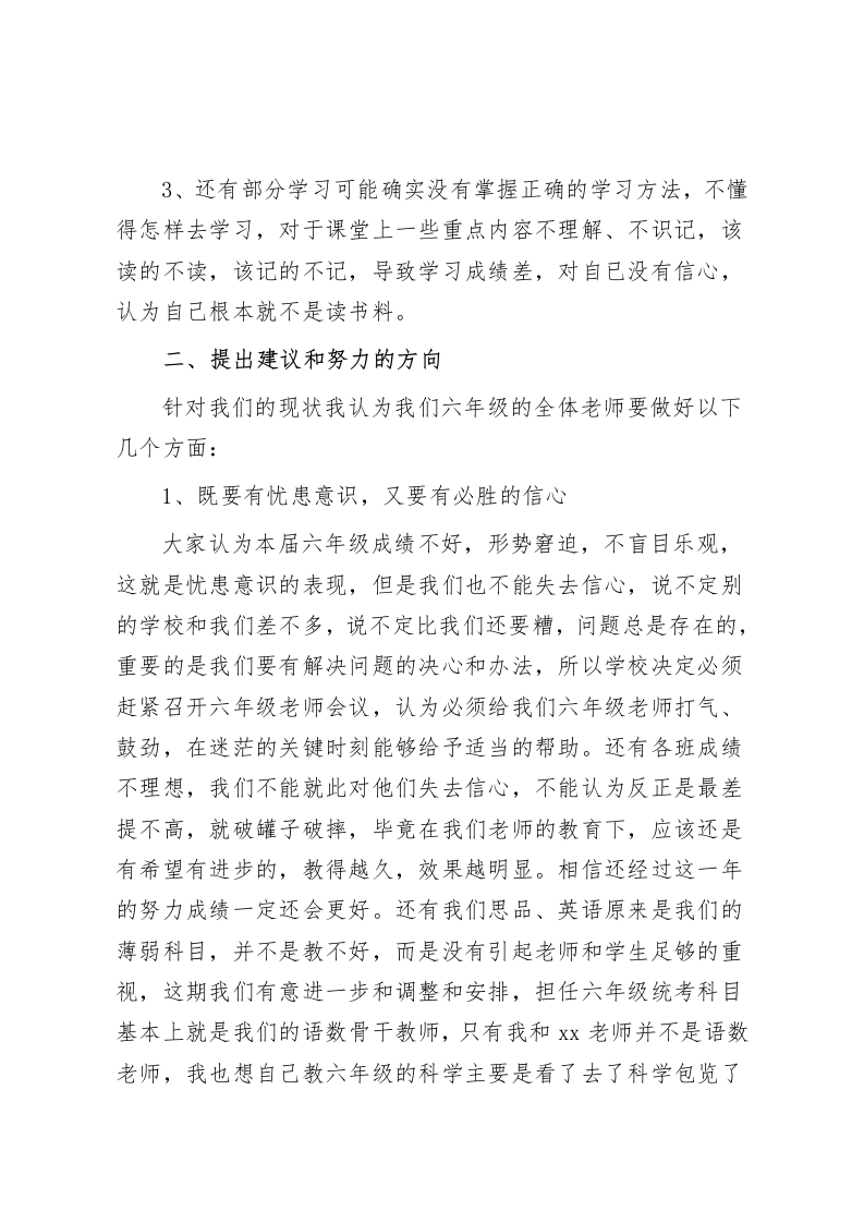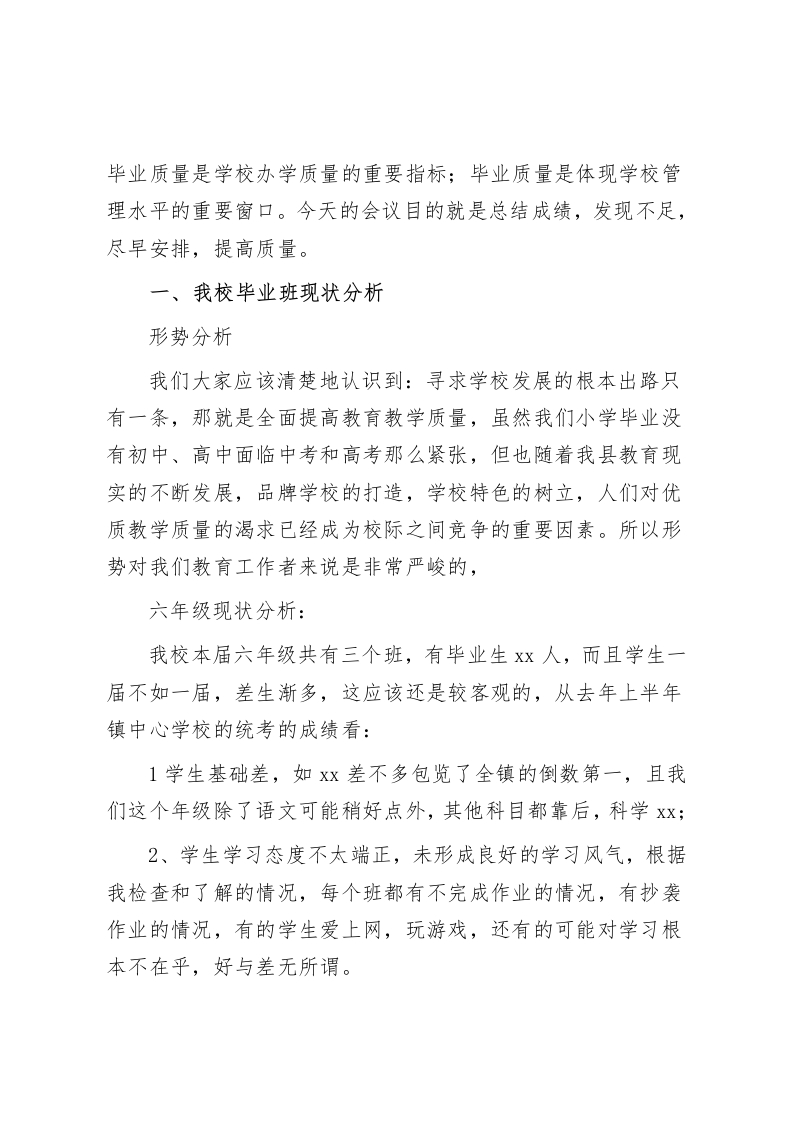 六年级毕业班教师会议上,副校长讲话今天的会议既是提升六年级教学质量的动员会,也是明确目标、加油鼓劲会各位领导、老师们:今天由我主持召开六年级全体教师会,我感到惶恐不安,原因之一:在座各位在小学教育教学方面都比我有经验,不允许我在这里班门弄斧:原因之二:学校把六年级这个重任交给自己,既是对我自己的信任,同时也是一个巨大的考验。不过我相信,在领导的关怀和在座各位老师的支持与帮助下,六年级的各项工作一定能够圆满完成,毕业考试也一定能够取得优异的成绩,为学校下一阶段进一步发展奠定坚实的基础。在这里,我首先代表六年级老师对各位领导对我们的厚爱表示感谢!再者,我作为学校副校长兼教导主任,我代表学校对大家的辛勤工作表示衷心的感谢,对老师们的关心不够表示歉意。六年级是小学阶段最后一年,不管哪个年级,教育教学压力和任务都比不上六年级大,因为到了这个时段学生的心理、生理都发生了重大的变化,思想波动较大,工作难度也增大。再加上我们核心压力,质量压力,县教育局统考,全县交叉监考,单人单桌。无疑体现了毕业班的质量对一所学校而言是相当重要的,其重要性体现在四个方面:毕业质量是检验教师教学成果的重要指标:毕业质量是反映学生阶段性学习的里程碑: