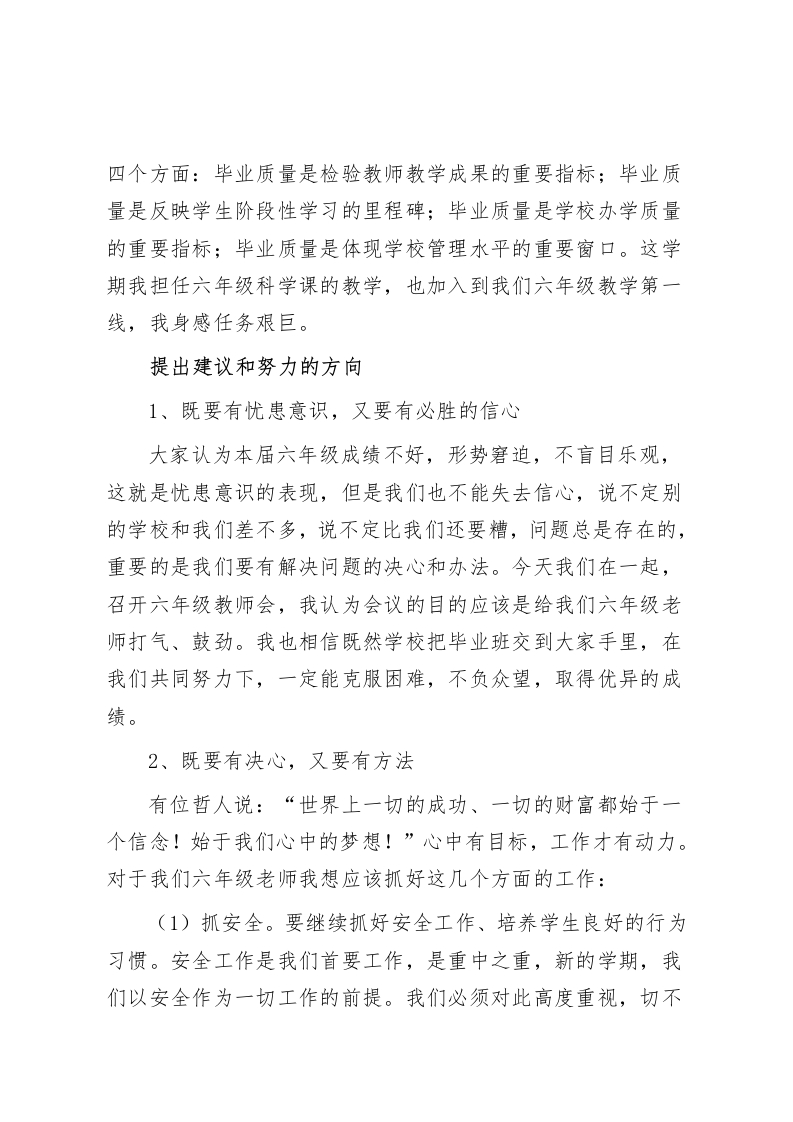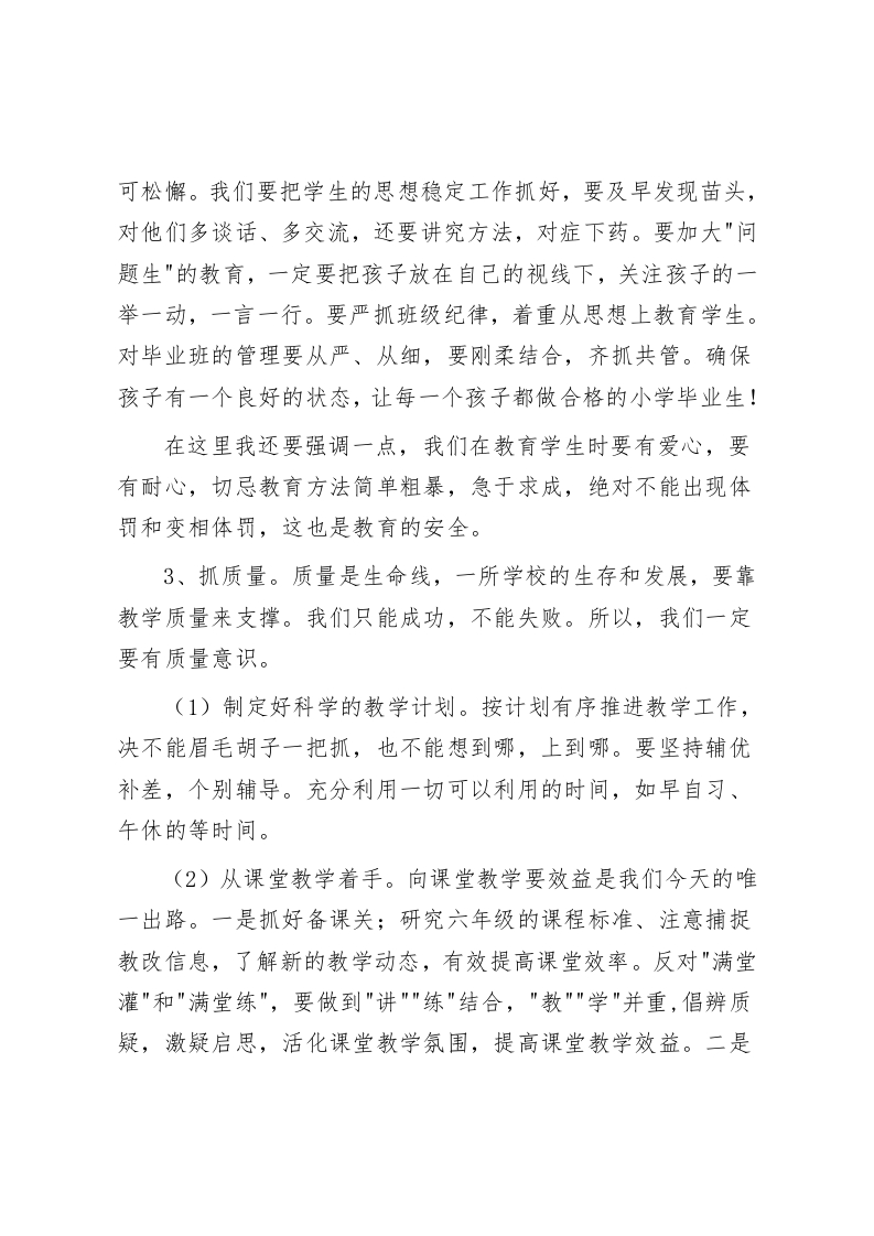 六年级毕业班教师座谈会,校长精彩发言今天的会议既是提升六年级教学质量的动员会,也是明确目标、加油鼓劲会各位老师好:今天,我们全体六年级任课教师聚集一起,共同探讨本届毕业班的工作,目的就是在抓好毕业班工作方面形成共识,在抓好毕业班工作方面形成合力,从而提高毕业班的教育教学质量,今天的会议程序:先由我代表教导处作个中心发言,然后请各位教师代表就自己任教的科目、班级管理等,分析本班学生学习状态,谈谈教学中存在的问题和困惑,并说说自己的决心、努力的方向和提高教学质量的方法和策略。最后由学校詹校长、胡校长给我们的工作作具体要求。首先我代表学校对大家的辛勤工作表示衷心的感谢,今年我刚刚担任学校教育教学工作,在很多方面还不是很了解,我也希望今天在座的老师们能对我现在和今后的工作提出宝贵的建议,共同为学校教育教学质量的提高努力。六年级是小学阶段最后一年,不管哪个年级,教育教学压力和任务都比不上六年级大,因为到了这个时段学生的心理、生理都发生了重大的变化,思想波动较大,工作难度也增大。再加上我们核心压力,质量压力,区教育局统考。无疑体现了毕业班的质量对一所学校而言是相当重要的,其重要性体现在