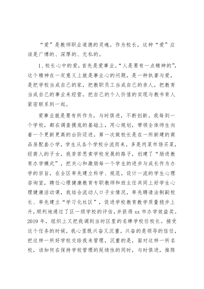 校长交流发言汇报修身立德,如何自觉地加强自身的师德修养尊敬的各位领导、同仁:大家好!非常荣幸能有这个机会站在这里能和各位分享交流。我是一名校长。一个在三尺讲台走过26个春秋的人民教师。记得我初任校长的时候,我的恩师曾经对我说过:校长是最优秀的教师,要“学高为师,身正为范”;校长是手持火把的领路人,要用爱经营,以德治校。是啊,校长对学校教育的影响太大了,以至于我们都能感受到这句话的震撼力“在某种意义上说,一个好校长就是一所好学校。”然而,当一个好校长实在是不容易!一个好校长不仅要有先进的教育思想,管理理念和渊博的知识,更要有强烈的责任心、使命感和高尚的人格魅力,纯正的师德修养。一句话,能是成就事业的关键,德是治校立身之根本。那么作为一名新时期的校长,应该如何修身立德,自觉地加强自身的师德修养?下面,我结合多年的经历,谈谈我的认识。一、以德修身(一)校长心中要有爱