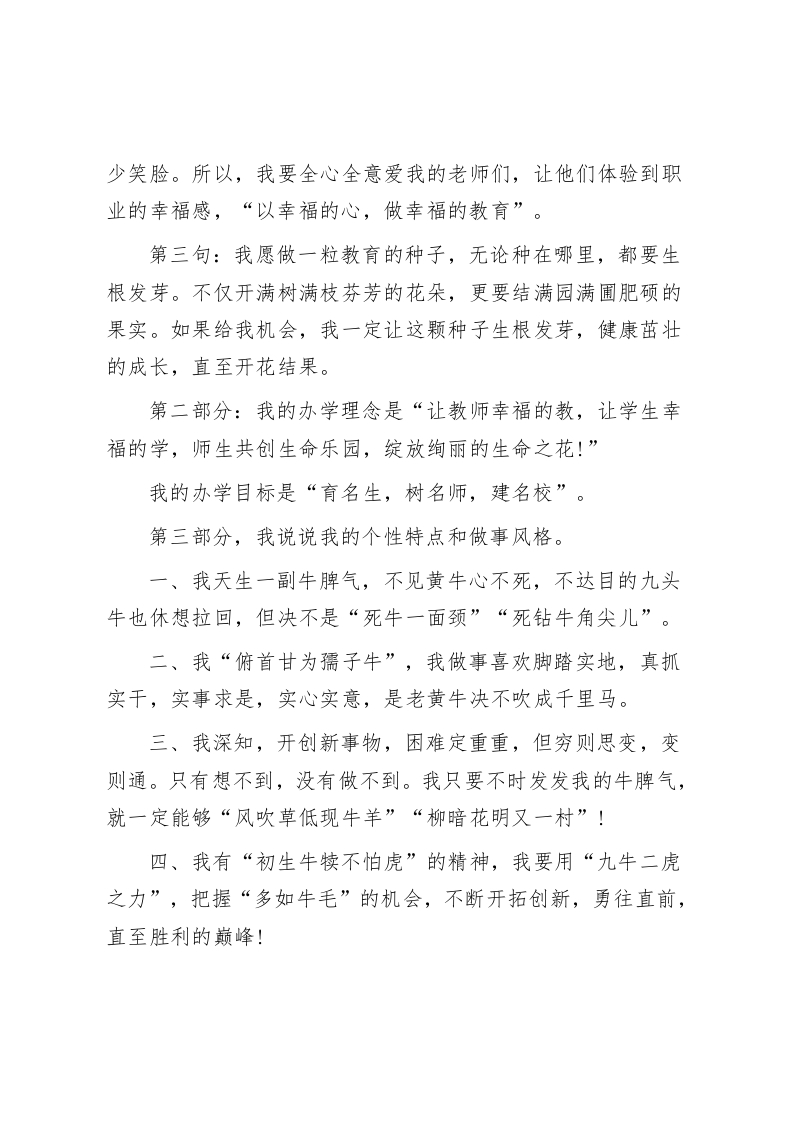 校长竞聘演讲,分3个部分进行演讲,并提出了办学目标尊敬的各位领导、各位评委老师:首先,我要向你们表达我最衷心的问候和最诚挚的谢意:您辛苦了!其次,我要感谢我们的程校长给我们这样一个公开、公平、公正的竞职机会,使我今天能够站在这个演讲台上。我演讲的内容分三部分:第一部分,我要用三句话来表达我办学的信念和决心:第一句:捧着一颗热心来,不带半根杂草去。这颗热心包括对祖国教育事业的无限忠爱,对学校烈火般的热爱,对老师春天般的挚爱,对学生慈母般的疼爱。不带半根杂草去,但有一天,当我离开这个学校的时候,我要带走三样东西:一、领导、家长满意的笑;二、教师幸福的笑;三、学生开心的笑。第二句:一切为了学校,一切为了教师,一切为了学生。我要尽我所能,尽我所爱,做好这三个一切。但我最先要做好的,是第二句,就是“一切为了教师”。古人云:国之兴,在于统;统之兴,在于人;人之兴,在于教。而教之兴,我认为在于教师。因为教师是决定一个学校兴衰的主力军。教师的素养,决定学生的素质,教师的情绪,决定学生的情感。一个校长如果不能让他的老师们笑起来,那么这个学校的未来就不会有多