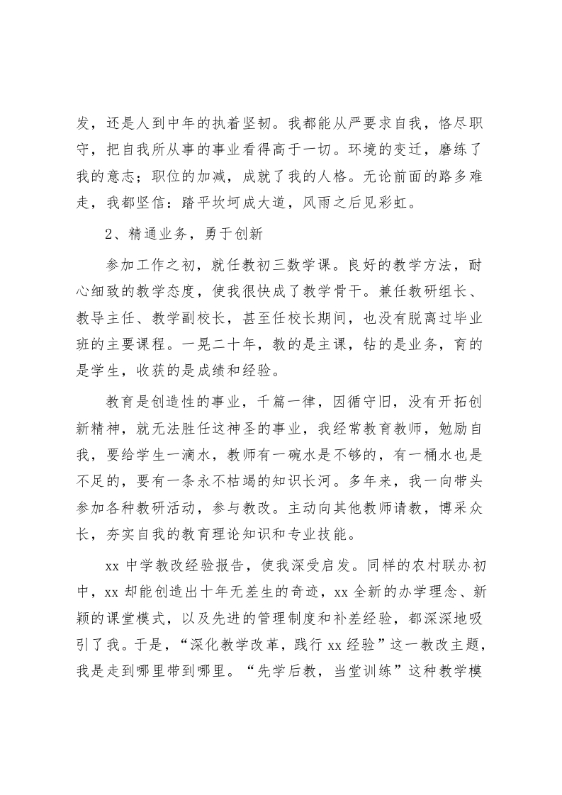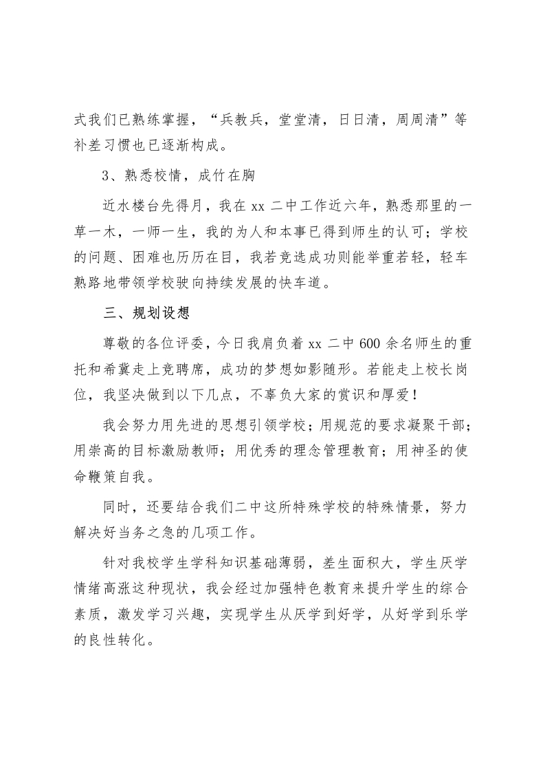 校长竞聘演讲从个人情景、竞聘优势、设想规划三方面做汇报尊敬的各位领导、各位评委:大家好!十分荣幸参加这次竞聘活动,感激你们给我搭建这一展示自我,推荐自我的舞台。现将我的个人情景、竞聘优势、设想规划等汇报如下,望各位评委认可和支持。一、个人基本情景我叫..,现年Xx岁。年参加教育工作,中共党员,本科学历,中学一级教师。现任*二中副校长,分管教学工作。二、任职优势:1、熟悉管理,经验丰富从教二十二年,我从普通教师逐步成长为一名管理工作者,先后担任过*乡中教导主任,副校长、校长、*乡中心学校校长,**中代校长。主抓过教学工作、政教工作、后勤工作,熟悉学校工作的各个环节,积累了较为丰富的管理经验,曾带出一大批作风踏实、思想先进的学校管理者。17年的管理岗位,我走过的路如同一条抛物线。但无论是5年政治管理工作,还是12年副职的协调工作;无论是木植街的山高水远,还是县城的现代繁华:无论是初上讲台的意气风
