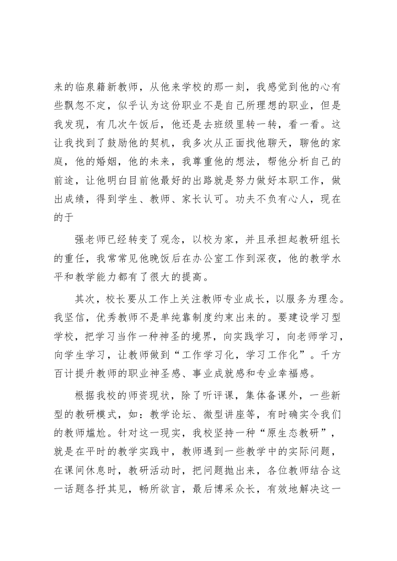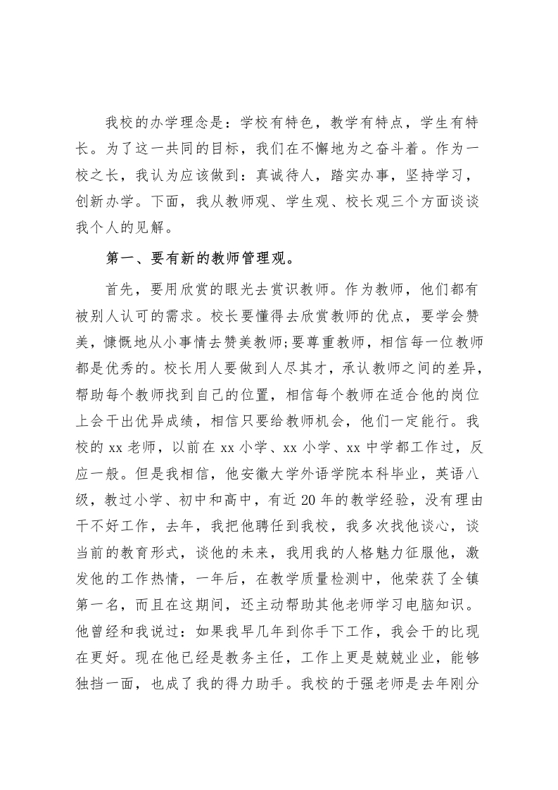 校长论坛上发言坚守三个观点塑造学校之魂尊敬的各位领导、各位校长:大家好!今天我演讲的题目是“坚守三个观点塑造学校之魂”。畅谈校长管理方略,对我而言,有“镜中花,水中月”之嫌。在此,我只想与各位领导和校长交流一下在工作中的一些感悟,与大家共勉。从任职伊始,我就坚信一个理念:校长是一所学校之魂,是学校的发展之魂。一个好校长可以造就一所好学校。校长要谋划学校之魂,塑造学校之魂,守住学校之魂。这个魂就是学校要有一个鲜明的办学理念,明确的办学目标,清晰的办学思路,激励人心和鼓舞士气的教风和学风,要创新不守旧,不盲从,不跟风,接地气,在全体教师中形成共识,外化于行,内化于心,变成工作中的自觉行动。刘彭之校长说过:校长是个领跑人一一面向世界,面向未来,面向现代化,领着全校的教职员工不停地奔跑,领着一茬又一茬的孩子不停地奔跑。领跑人的办学理念在奔跑中反应,领跑人的心智情感在奔跑中展现,领跑人的人生价值在奔跑中实现。