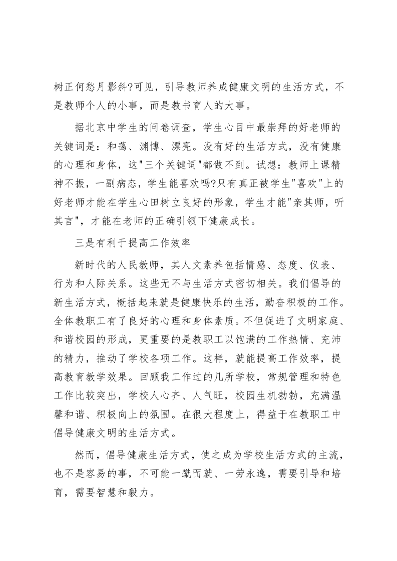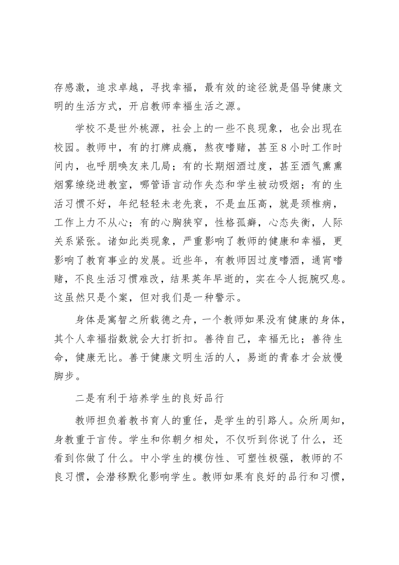 校长论坛上讲话谈教师生活方式这个小命题各位领导、各位同仁:大家好!在今天颇有创意的校长论坛上,我想谈谈教师生活方式这个小命题。我认为,一名教师,个人不同的生活方式,关乎其本人的身体健康、工作业绩和人生幸福:一所学校,教师们主流的生活方式,关乎师资队伍建设,更关乎整体办学水平。因此,我担任中学校长十二年来,一以贯之的在我任职学校积极倡导教师健康文明的生活方式。我所倡导的健康文明生活方式,是指既有益于健康又具有一定精神品位的行为习惯。表现为无不良嗜好,生活有规律,注重保健,端庄儒雅,心态平衡,爱好有益活动等等。实践中,我深深感到在教职工中倡导健康文明生活方式,有着与其他职业显著不同的积极意义。一是有利于增加教师本人的幸福指数我们曾听到不少教师这样评价自己的生活:工作真辛苦,精神很疲惫,报酬太低廉,青春在流逝。在我们无力改变教师客观生存状况的前提下,要帮助教师正视现实,悦纳自我,心