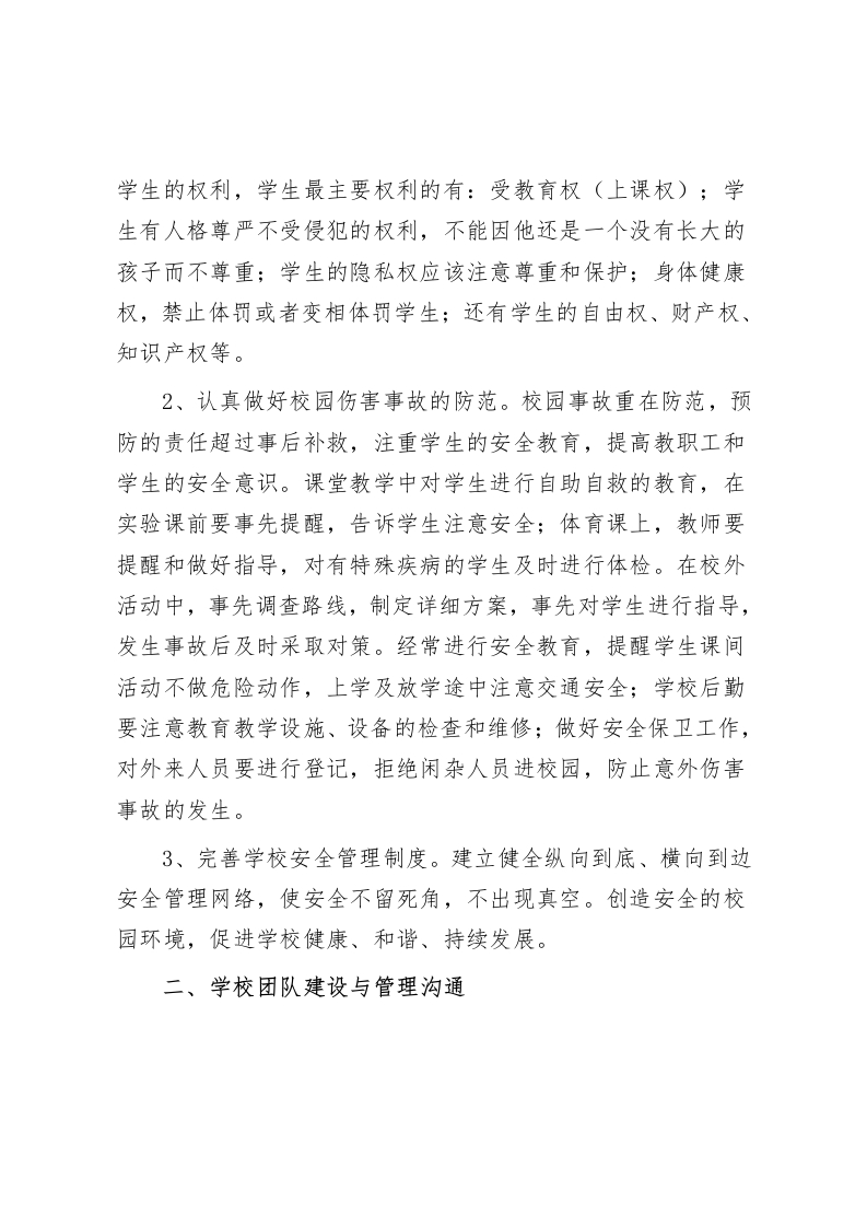 校长培训学习心得通过这次培训,提高了认识,明确了职责我有幸参加了Xx教育局主办的农村学校校长培训班的学习,虽然时间短暂,但受益非浅。让我体会到作为一名教师,能参加此次培训,真是一次大好的机遇和学习的机会,使我真正领悟到了参与式管理,以儿童为中心,以人为本的新理念、新思想的现代教育摸式。明确了校长与学校管理,教学支持与学校发展的内在联系。下面就我的学习和认识谈几点心得体会.一、依法办学,依法治校听了上海市教育局政策法规处一-一朱坚老师,讲学校相关法律课之后。让我也更加了解与学校治理相关法律有了更深刻的理解。切实感到“依法治校”不应是简单的口号,而应成为学校管理者和每一个教师切实的自觉行动。朱老师从法治与依法治校、学校和校长在管理中的主要法律权利、学生的主要法律权利、学校事故的归责原则及防范等四个方面作了较为详细的阐述。特别是具体生动的案例,给我们更多的警示和提醒,对于提高依法治校的自觉性起到了较大的指导作用。现结合实际谈一点自己的想法:1、切实保障学生的各项权利。加强《教育法》《教师法》《未成年人保护法》等法律法规的学习,让全体教职工了解有关的法律知识,树立法治观念,提高依法施教的自觉性,保障