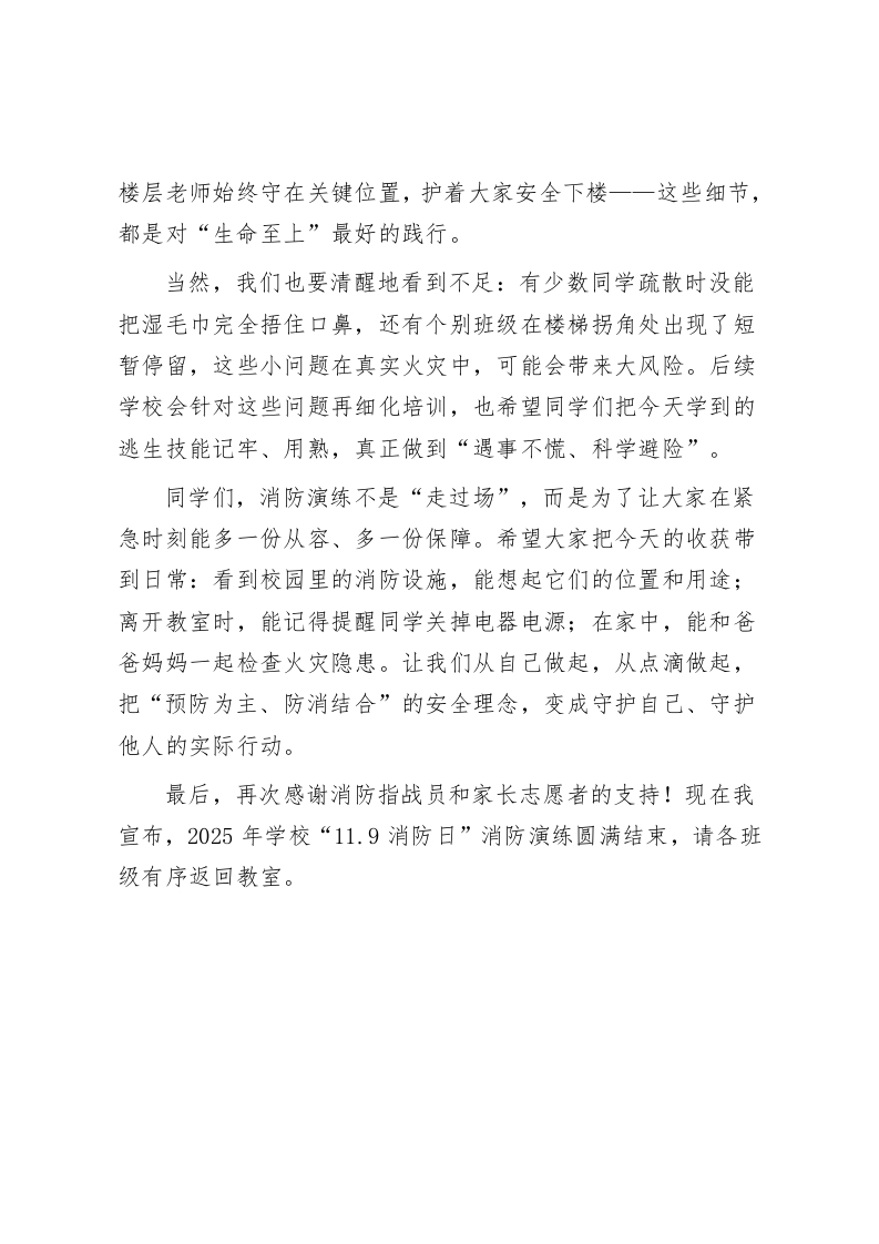 校长在2025年学校“11.9消防日”消防演练上的讲话老师们、同学们:上午好!今天,我们齐聚操场,圆满完成了2025年学校“11.9消防日”消防演练。首先,我要代表学校,向全程给予专业指导的辖区消防救援站指战员表示最衷心的感谢,向积极协助维持秩序的家长志愿者、认真组织疏散的全体教职工,以及听从指挥、有序撤离的每一位同学,道一声“辛苦了”!2025年11月9日是第34个全国消防日,今年消防宣传月的主题是“全民消防、生命至上一一安全用火用电”。对于学校来说,校园安全是底线,更是生命线。咱们同学年龄小,对火灾危险性的认知还不够深,自我保护能力也需要不断加强,而一场贴近真实的消防演练,就是给大家上的一堂“生命安全必修课”。刚才的演练里,从预警指令发布、烟雾模拟火情,到大家用湿毛巾捂紧口鼻、弯腰沿右侧有序疏散,再到消防员叔叔演示消防服穿戴、灭火器“提拔握压”使用方法,每一个环节都围绕“安全”展开。我看到,很多班级撤离时安静有序,没有推挤;不少同学牢牢记住逃生要点,正确做好防护;班主任和