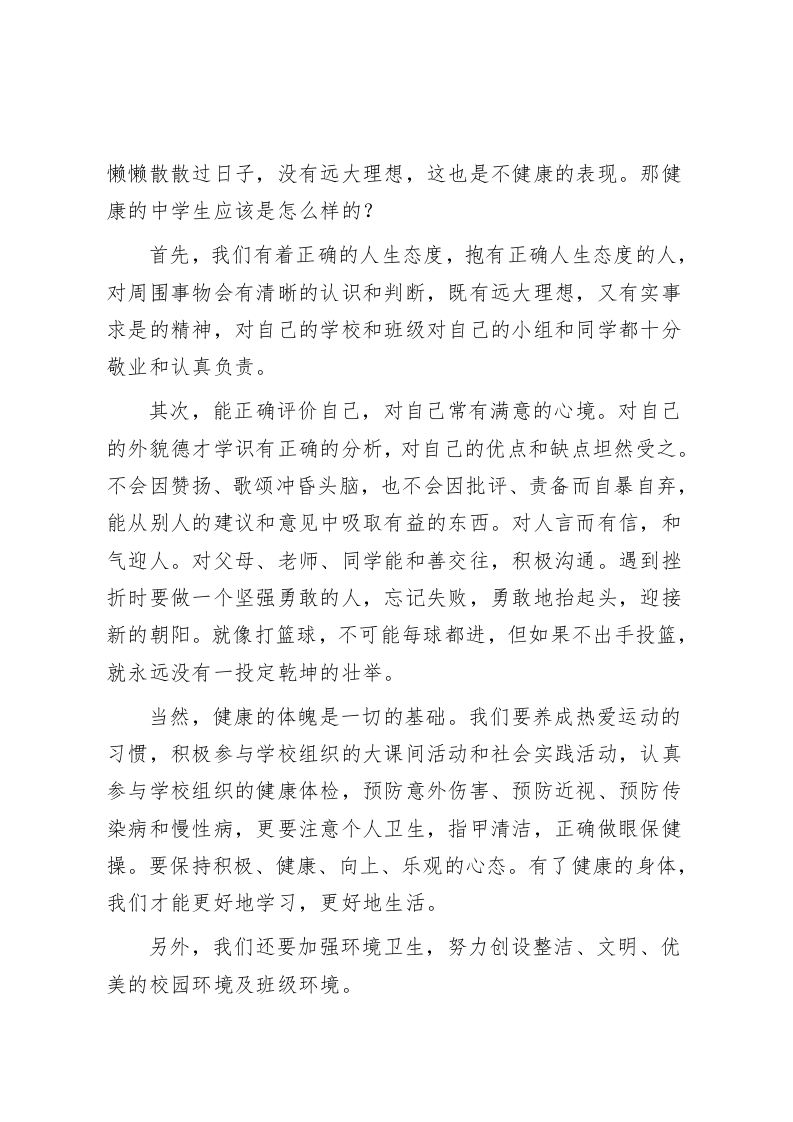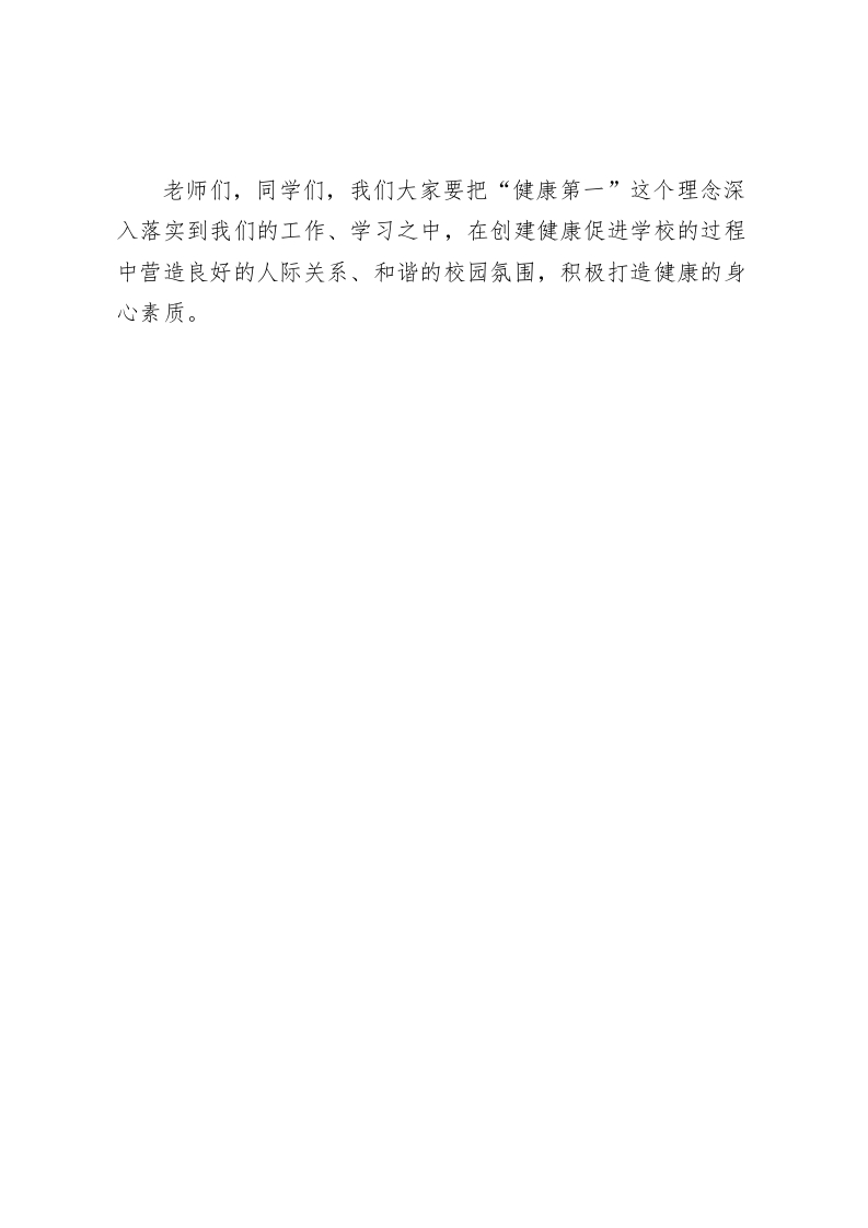校长在国旗下讲话创健康促进学校,做身心健康学子各位老师、同学们:大家早上好!我们说健康是生命的基石,拥有一个健康强健的体魄是每个人的追求。所以今天我想跟大家分享一个主题是:创健康促进学校,做身心健康学子。人的生命是宝贵的,相对于历史的长河来说,人类个体的生命又是短暂的,如何提高个体生命的质量,使我们的生命变得更有意义、更有价值呢?健康是最重要的指标之一。同学们可能觉得身体不生病就是健康,其实健康的含义远远不止这些,世界卫生组织对健康的定义包括生理健康、心理健康和对社会的适应能力,现在又加入了人的道德品质。一个健康的人不仅仅是身体没有疾病,还要具有完整的生理和心理状态,以及良好的社会适应能力和高尚的道德品质。健康是我们的理念,健康关乎每个人的未来。同学们身上都会存在着一些健康小问题:比如有的同学不能正确对待学习,上课不能够专心听讲。有的学生极易产生焦虑、紧张等心理问题,有的学生害怕与他人交往等等。还有一些同学回家常常想着玩手机,虽然在手机承诺书上签下了自己的承诺,但还是不能控制住自己,作为一位中学生,不为自己学业花时间精力,